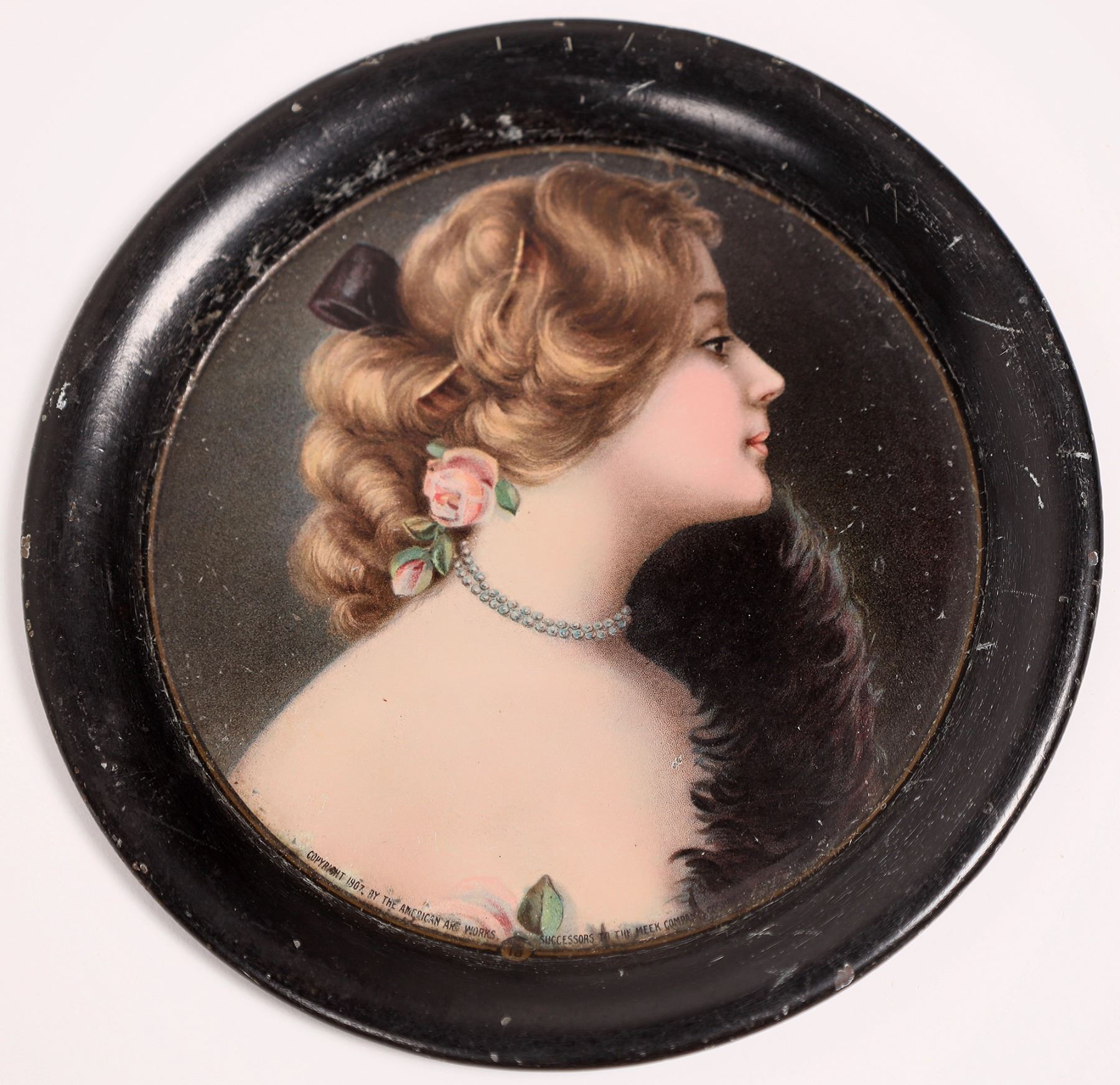 Vintage metal tip tray, most likely from the late 19th century, circular, about 4 ¼ inches in diameter, with an image of a young woman with flower earrings (est. $100-$150).