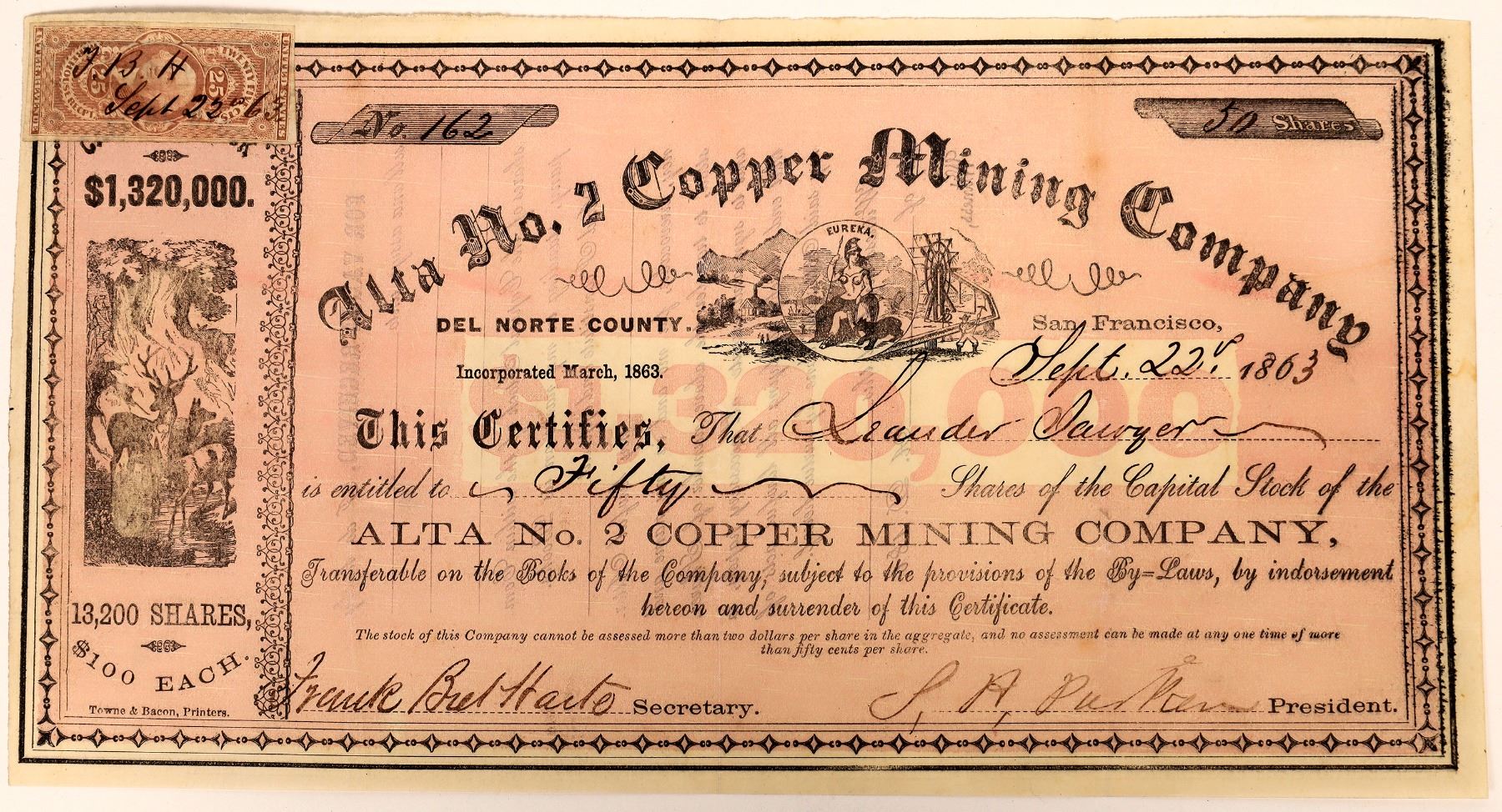 Alta No. 2 Copper Mining Company stock certificate issued on Sept. 22, 1863, #162 for 50 shares to Leander Sawyer, signed by author Bret Harte signs as secretary (est. $4,800-$10,000).