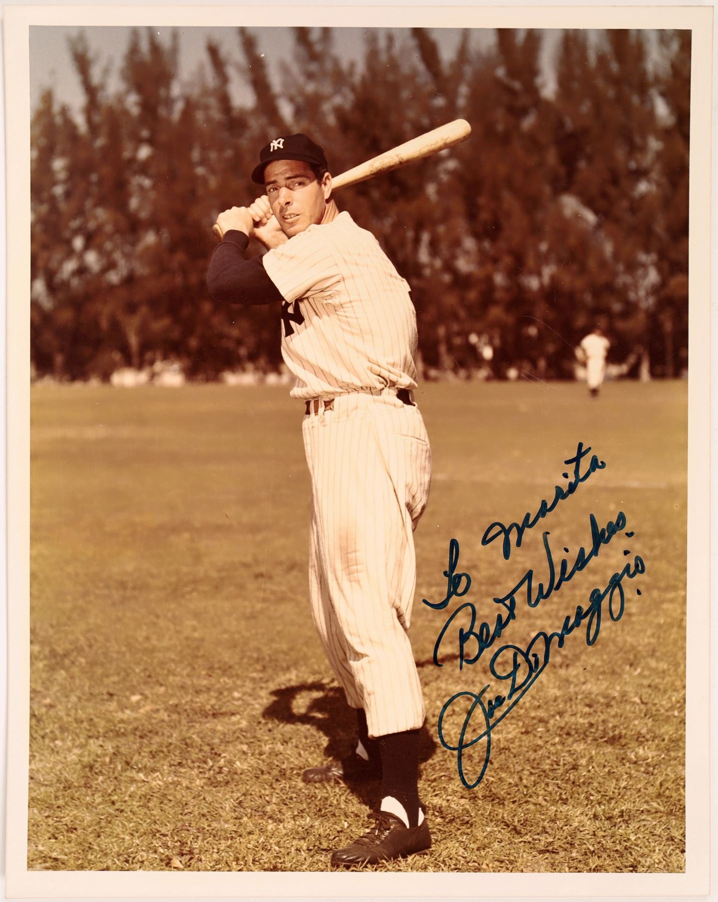 An expected Day 2 high achiever is the 1940s-era, 8 inch by 10 inch color photograph of the legendary baseball player Joe DiMaggio (1914-1999), shown striking a batting stance in his New York Yankees uniform (est. $200-$350). The photo is inscribed to “Marita” and the signature is crisp and clear. DiMaggio grew up in Martinez, California, the son of a fisherman. He went on to earn a place in the Hall of Fame and was briefly married to the equally famous Marilyn Monroe.