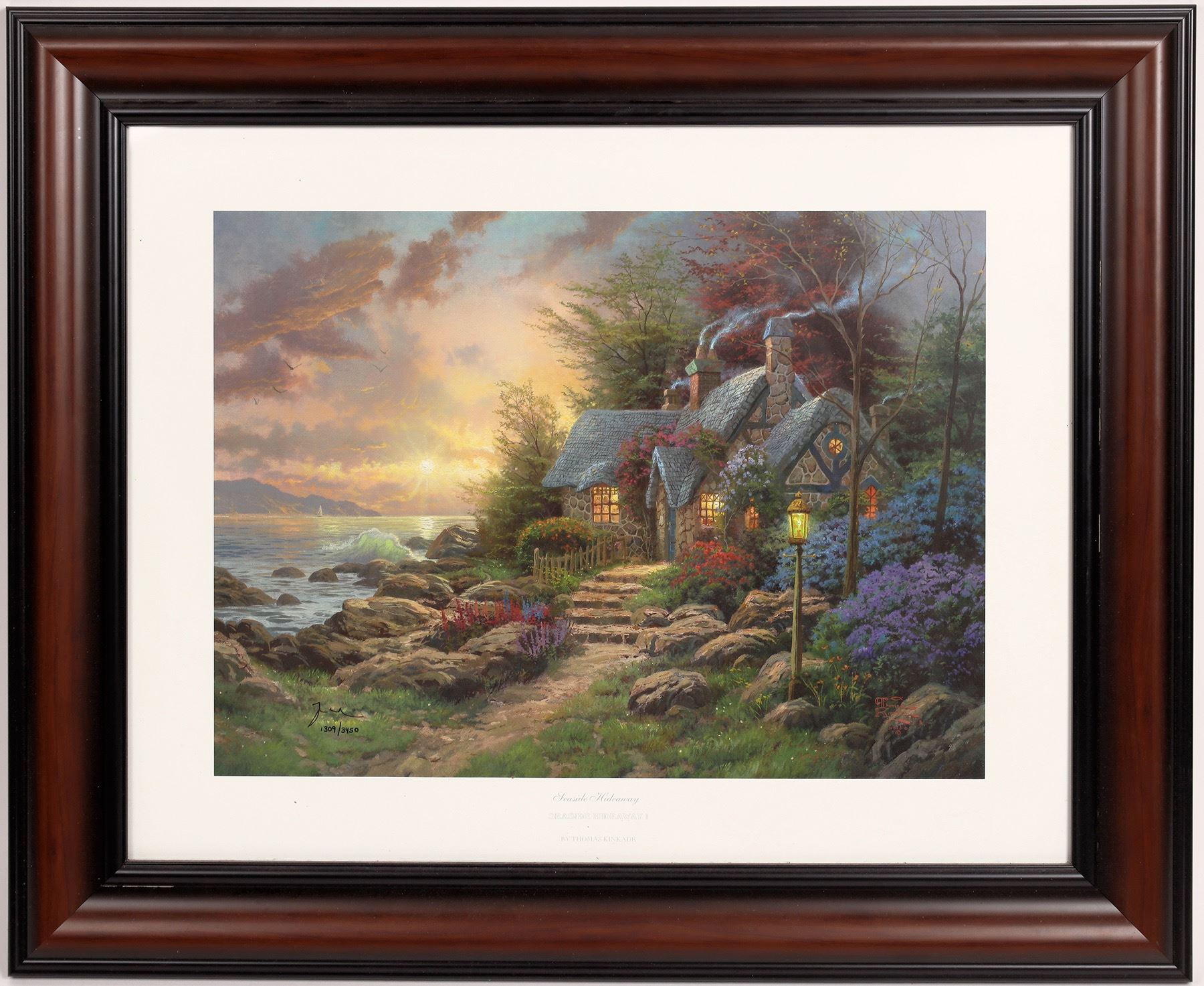A Day 1 highlight lot is the group of six framed Thomas Kinkade reproduction prints, not signed or numbered. These are reproductions of paintings of cottages, bridges, and landscapes. There is a seventh print that is not a Kinkade. It is a reproduction of a painting of a Texaco gas station and general store in a rainstorm. All of the prints are beautifully matted and framed. Overall sizes vary from about 16 ¾ inches by 13 ¾ inches to 24 ¼ inches by 20 ½ inches (est. $300-$400).