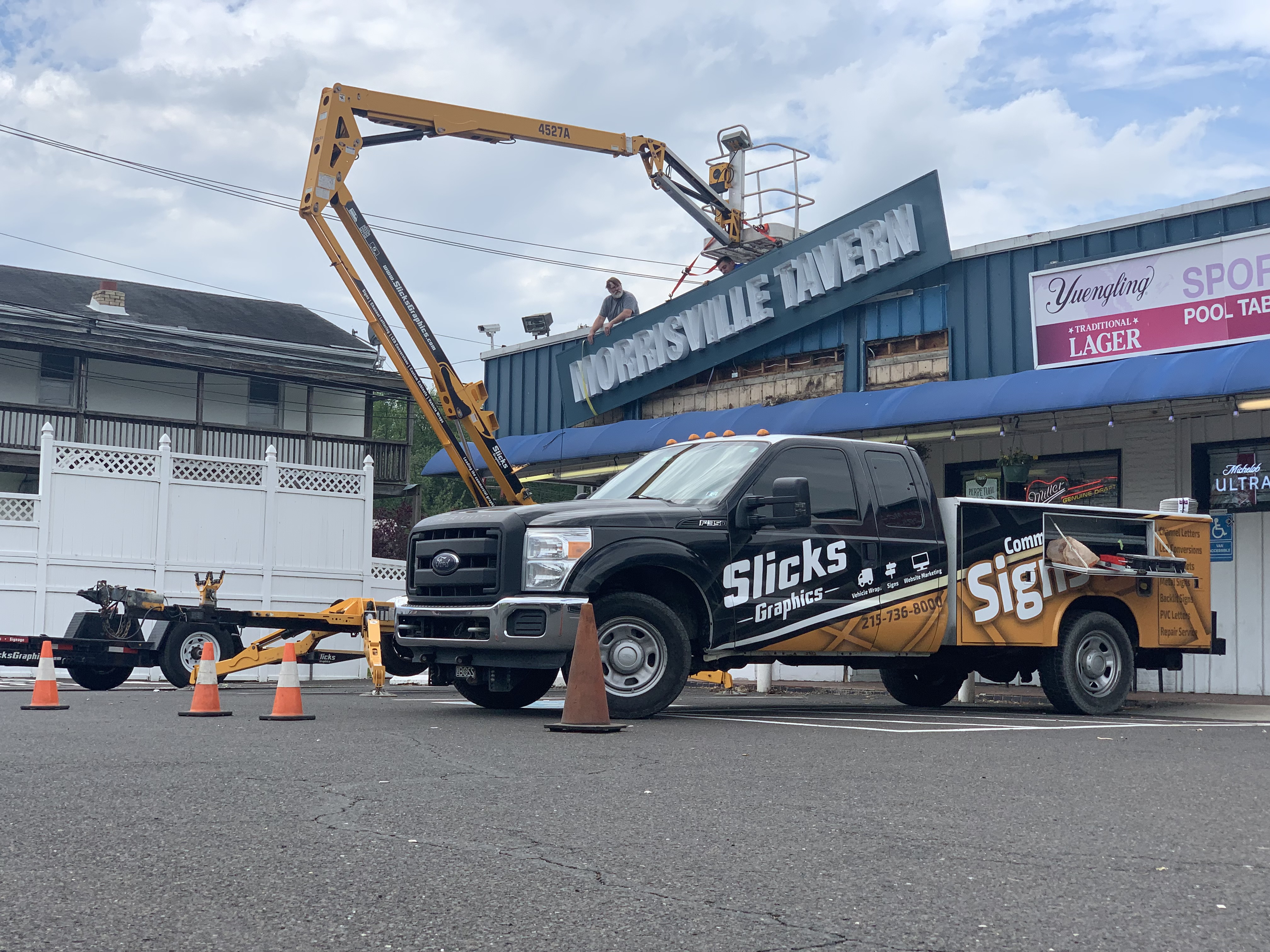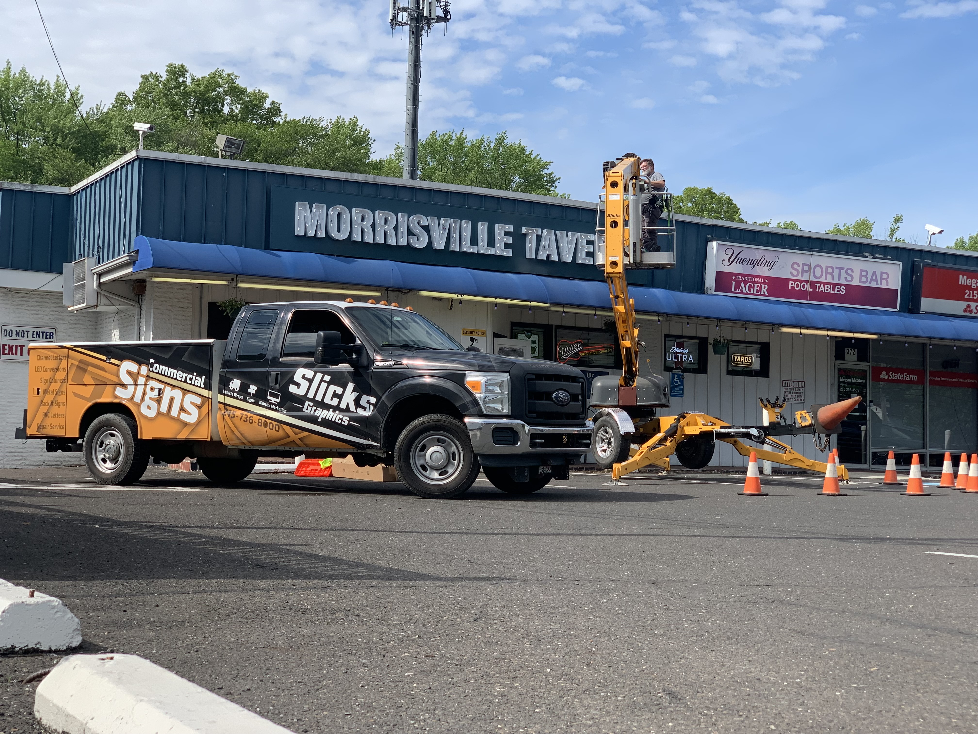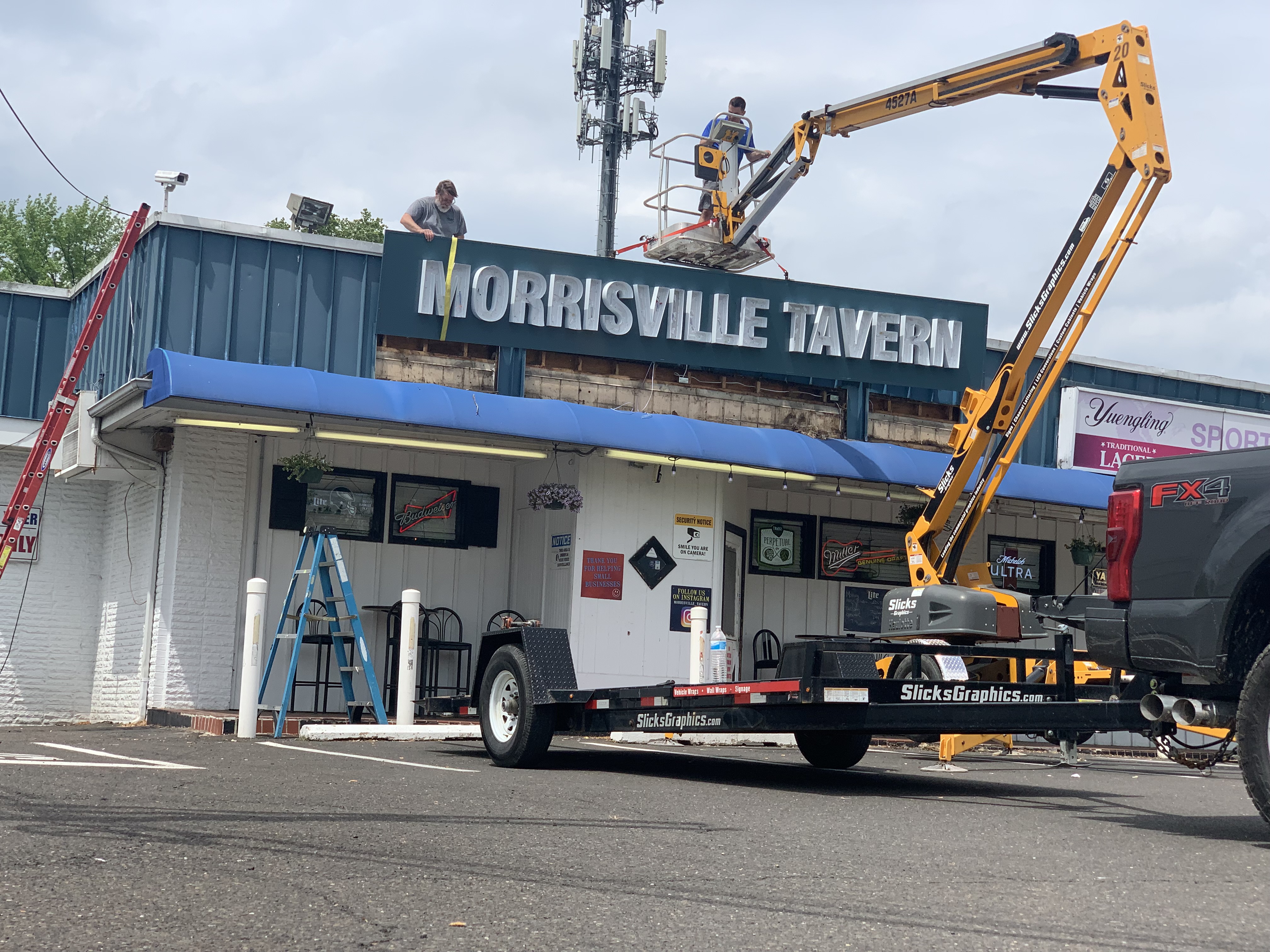 MORRISVILLE, PENNSYLVANIA, UNITED STATES, May 25, 2022 /EINPresswire.com/ -- Slicks Graphics was thrilled to be connected with the local community's preferred place for a pint. Morrisville Tavern was equipped with three old and weathered cabinet signs that have seen better days and they wanted to get a more modern sign that would stand out. After they contracted Slicks Graphics to replace the signs, they got right to work with planning, fabrication, and then of course, installation.All of the signs, vehicle and trailer wraps, including fleet graphics, are designed, produced, and fabricated in house at the Slicks Graphics headquarters in Morrisville, Pennsylvania. The Morrisville Tavern sign was no different. First, Slicks Graphics began with utilizing their latest equipment acquisition - the SDS Inc. ChannelBender. This newly acquired piece of hardware allows Slicks Graphics to provide their clients with higher quality and longer lasting channel letters. With the added accuracy of the SDS ChannelBender, a new channel letter sign is sure to give a unique look amongst the competition.