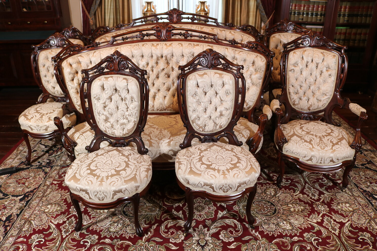 Magnificent 8-piece rosewood parlor suit by George Henkel (N.Y.), with beautiful new period style upholstery, the sofa 84 inches wide (est. $4,000-$7,000).