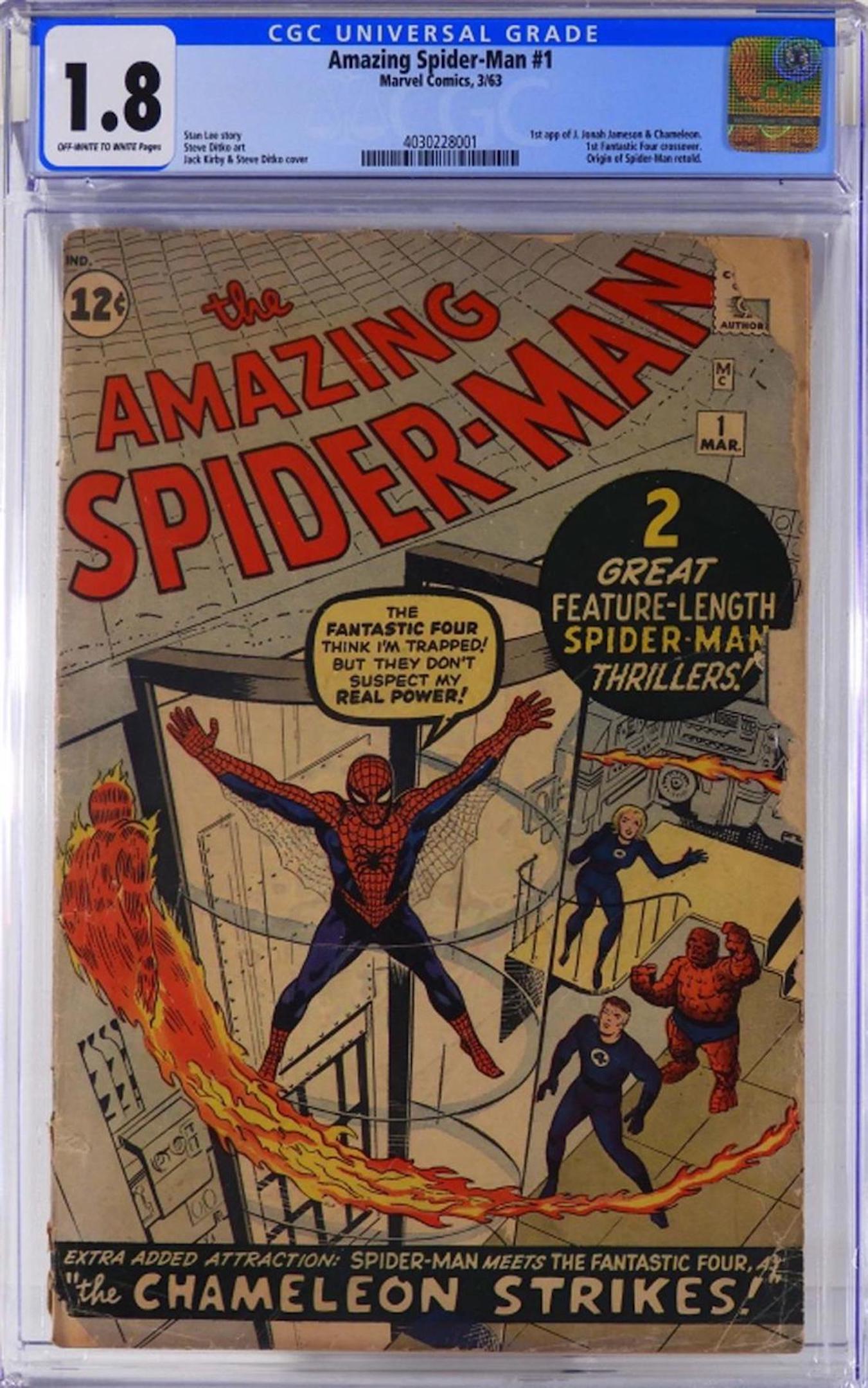 A copy of Marvel Comics Amazing Spider-Man #1 (March 1963), graded CGC 1.8, with the first appearance of J. Jonah Jameson and Chameleon, the first Fantastic Four crossover, plus a retelling of the origin of Spider-Man, brought $10,938. Also, a copy of Marvel Comics X-Men #1 (Sept. 1963), featuring the origin and first appearance of the X-Men and Magneto, graded CGC 5.0, with a slight restoration, changed hands for $10,625.