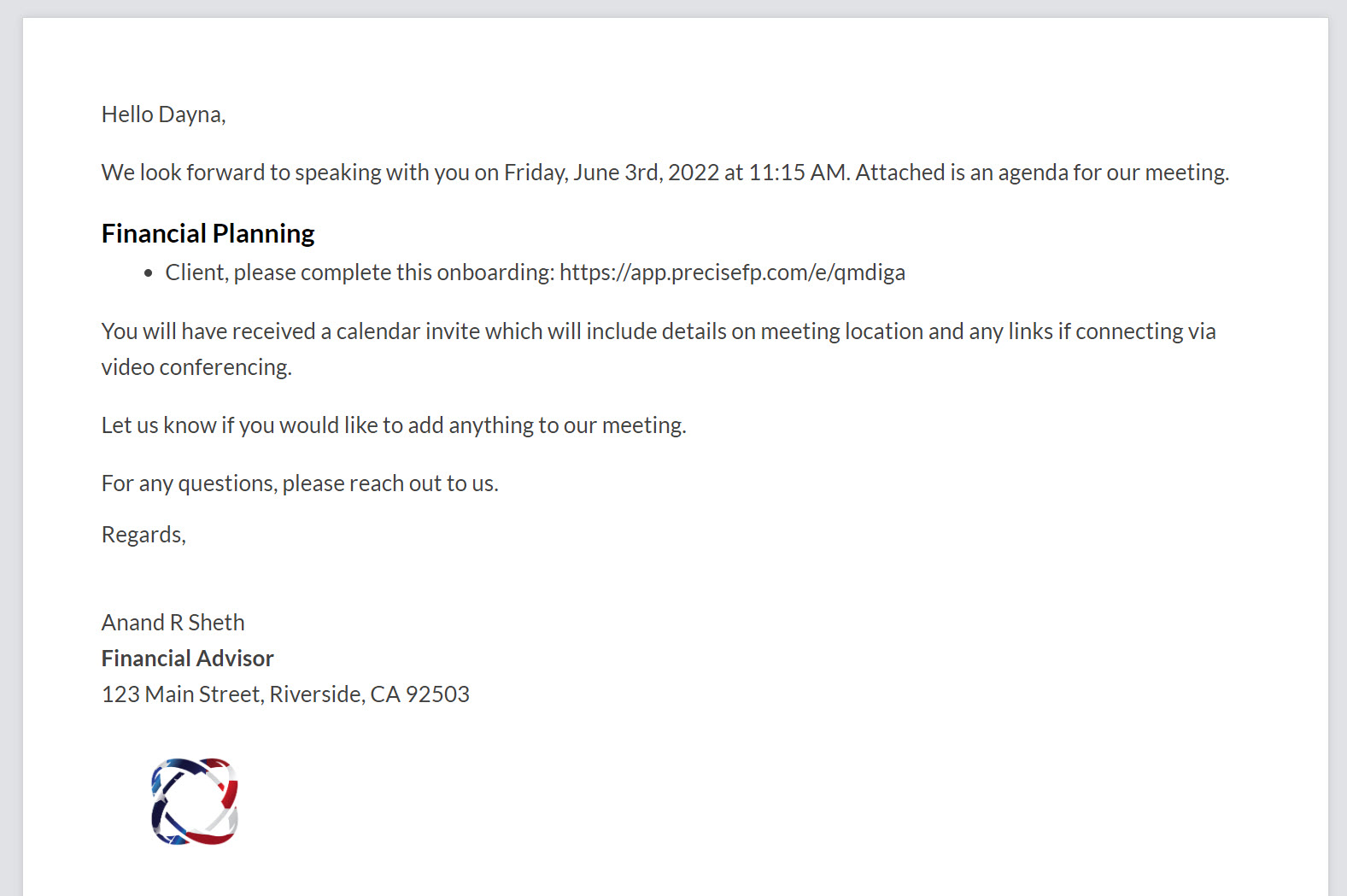 Advisors can now send out onboarding forms in seconds. Currently, advisors will manually copy and paste engagement links from PreciseFP into their own email – wasting their precious time. Now, financial advisors can click the PreciseFP button and generate engagement links directly within Pulse360 - removing the need to copy and paste. For example, advisors can generate a PreciseFP onboarding link and send a personalized email to a client or prospective client in seconds. Our automation will connect via API directly to PreciseFP, pull up the relevant contact information, and bring in the engagements seamlessly in Pulse360.