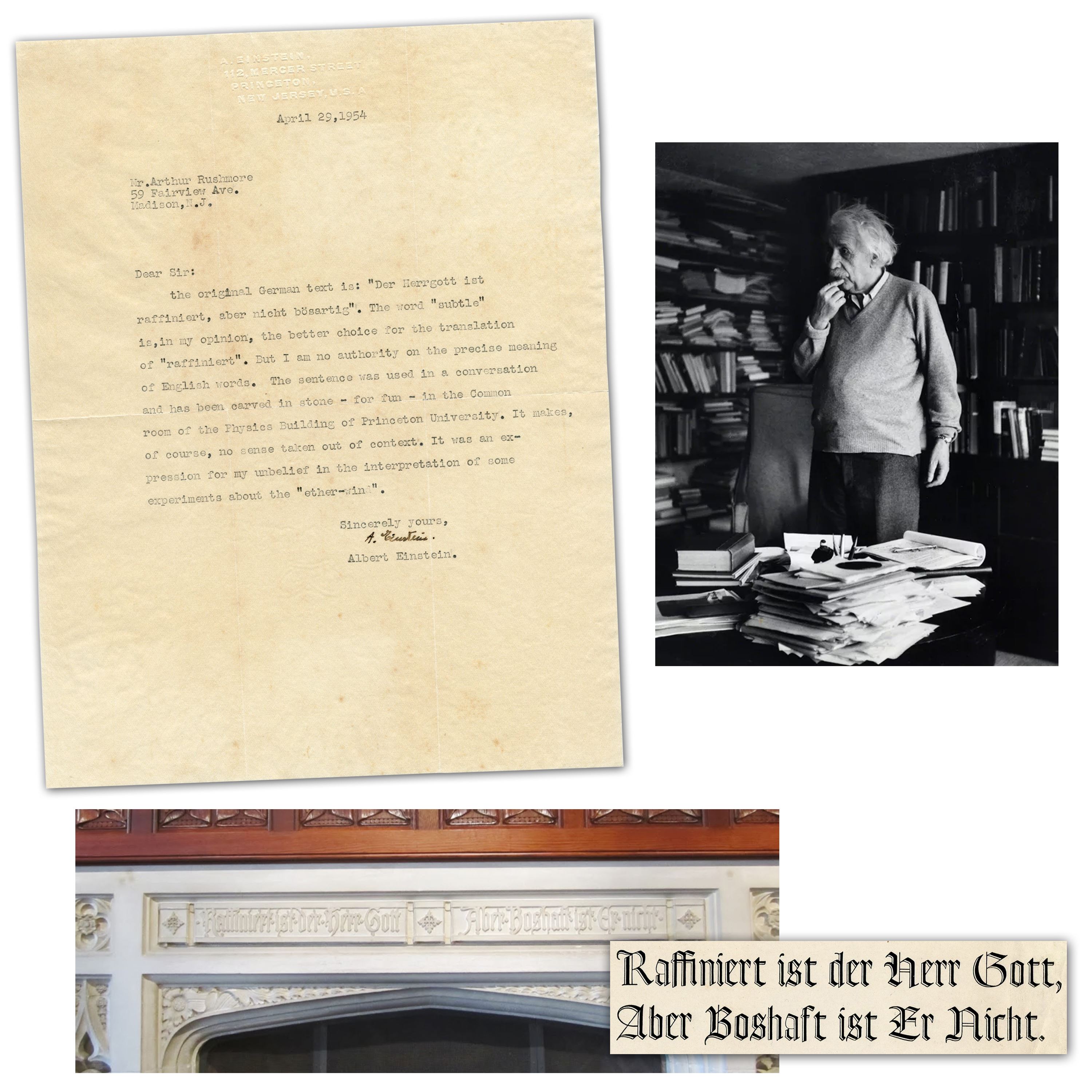 In a typed letter in English, signed and dated April 29, 1954, Albert Einstein explains the origins of his scientific motto, “Subtle is the Lord, but not malicious,” which encapsulates his personal attitude towards God and spirituality. Einstein first used the motto when responding to another scientist’s claims to have disproved relativity by discovering “ether-drift” (est. $60,000-$70,000).