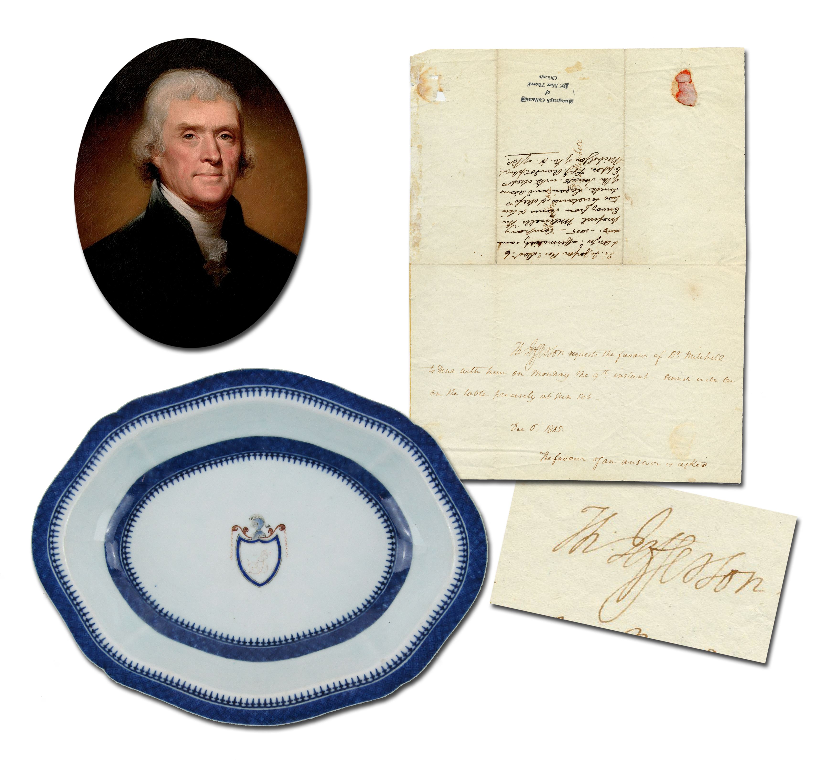 • Thomas Jefferson’s signed dinner invitation as President in December 1805, accompanied by a Jefferson-owned Chinese Export rare oval serving bowl, from the collection of Thomas Jefferson Coolidge, Jefferson’s great-grandson. The serving bowl features a “J” monogram and early Republican imagery such as the 13 stars (est. $18,000-$20,000).