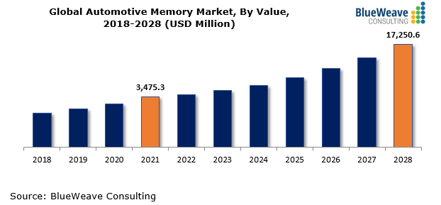A recent study by the strategic consulting and market research firm; BlueWeave Consulting revealed that the Global Automotive Memory Market was worth USD 3,475.3 million in 2021 and is projected to reach up to USD 17,250.6 million by the year 2028, growing at a CAGR of 23.9% over the analysis period of 2022-2028. The expansion in the Automotive Memory market can be primarily attributed to the emergence and incorporation of several advanced features such as advanced driver assistance systems (ADAS), predictive and self-intelligence systems, and other capabilities in automotive. Such features necessitate the use of an automotive microcontroller as memory is built into automotive microcontrollers for data storage and transport. Thus, growing demand for these advanced features is expected to bolster the market for automotive memory over the forecast period 2022-2028.