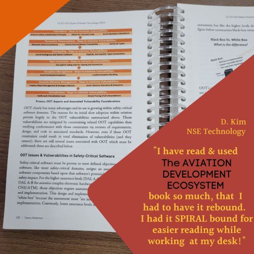 Today, aviation systems are increasingly integrated, complex, and inter-related. A new Ecosystem approach is required to succeed in aviation development. In his latest book Aviation Development Ecosystem, Vance Hilderman, one of the world's foremost authorities on aviation development and certification clearly describes and explains in detail the true "Ecosystem" of aviation Safety, Systems, Hardware, and Software and "How To" apply the related standards and guidelines TOGETHER, including the following for aircraft, ground systems, eVTOL, rotorcraft, civil aviation, and military aircraft: