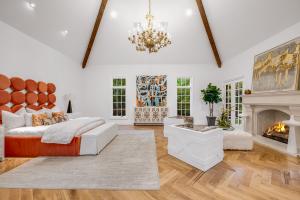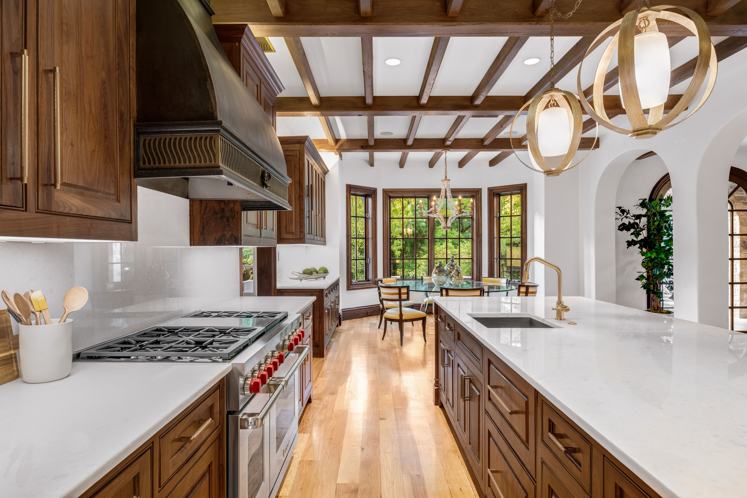 The expansive main house, designed by Robbie Fusch, exemplifies luxury from first sight of its French châteaux-inspired exterior. Grand turrets, steep slate roofs, and ornate windows lend a regal atmosphere to the entry. Indoors, discover entertaining spaces and accommodations that are light and bright without sacrificing any luxury. Seven sweeping bedroom suites compete to be the primary, each with unique details, like a marble ensuite or a soaring beamed ceiling tucked within a turret. Outdoors, a more modern-inspired infinity-edge pool is accented by a fire feature and terraced entertaining spaces that make alfresco entertaining as delightful as indoors, all overlooking Bachman Branch. From the thousand-bottle wine storage with private tasting room to the professional catering kitchen to the climate-controlled auto showroom, the estate’s treasures exceed every conceivable expectation.