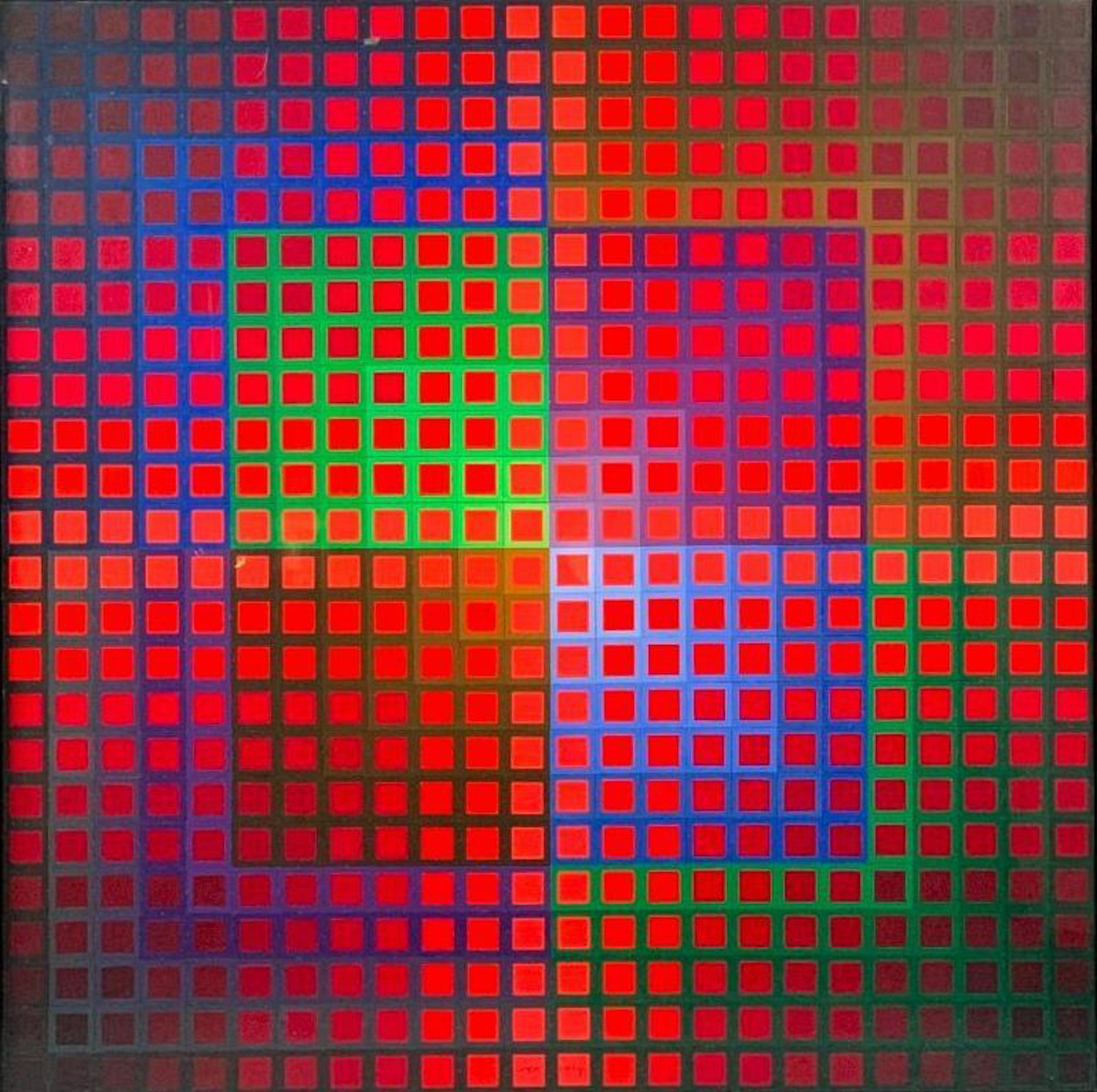 Paper collage (not a print) by Victor Vasarely (French/Hungarian, 1906-1997), titled Kontosch-C (circa 1968-1972), signed in ink, 36 inches by 35 ½ inches in the frame ($15,990).