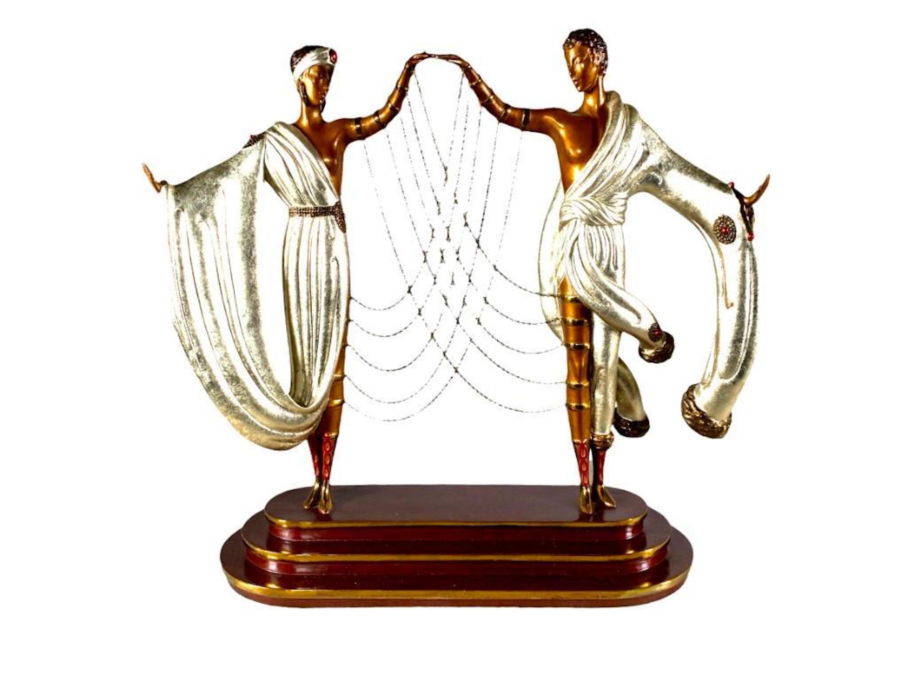 • A cold painted and parcel gilt bronze by the artist known as Erte (real name: Romain de Tirtoff, Russian/French, 1892-1990), titled The Wedding (1986), with a foundry mark for Fine Art Acquisitions dated 1986, numbered 166/375, 16 inches in height ($2,460).