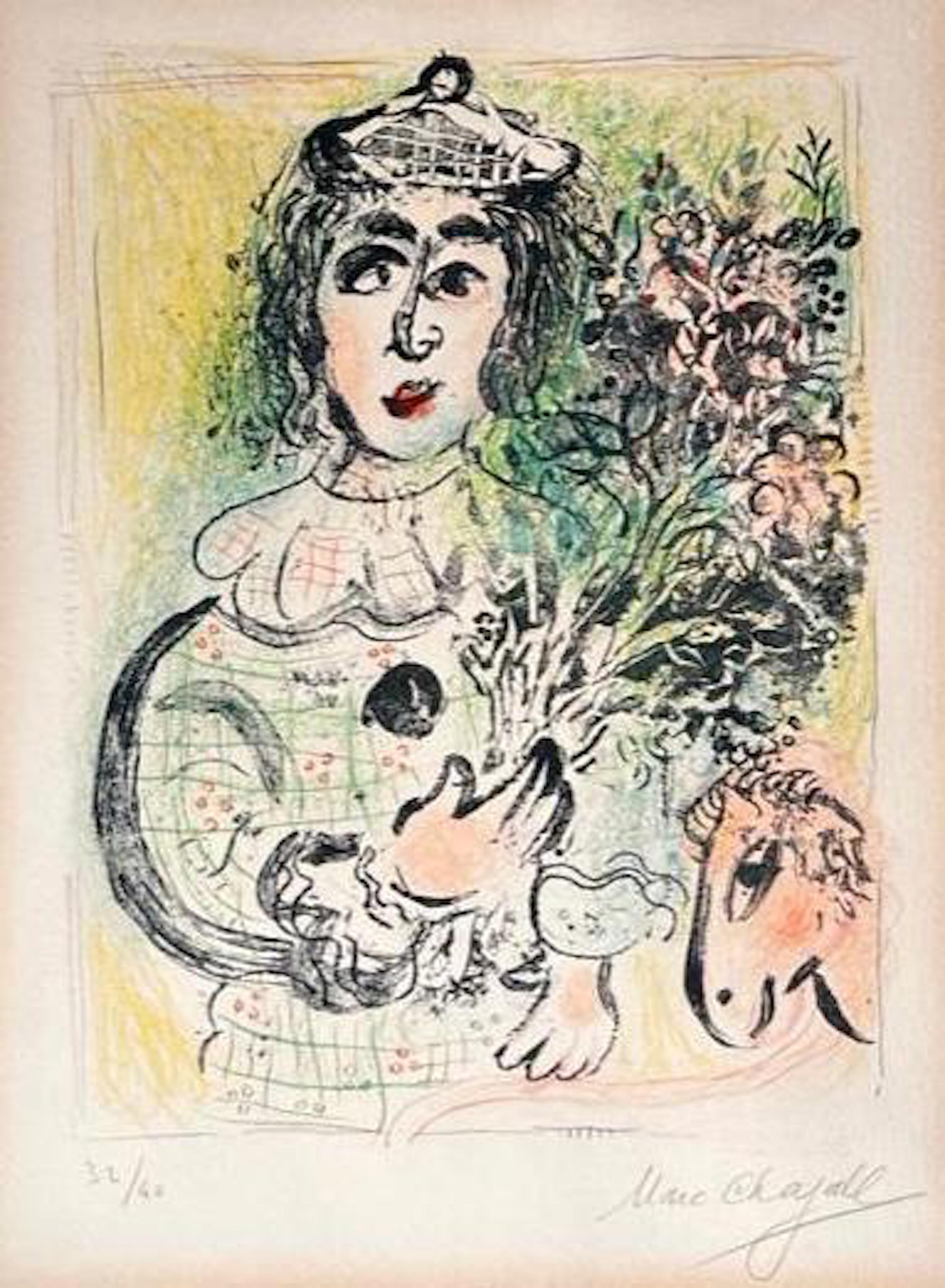 • A lithograph on Arches paper by Marc Chagall (Russian, 1887-1985), titled Clown with Flowers, signed in pencil lower right and numbered 32/90, matted and framed with an image size of 15 inches by 12 inches ($4,305).