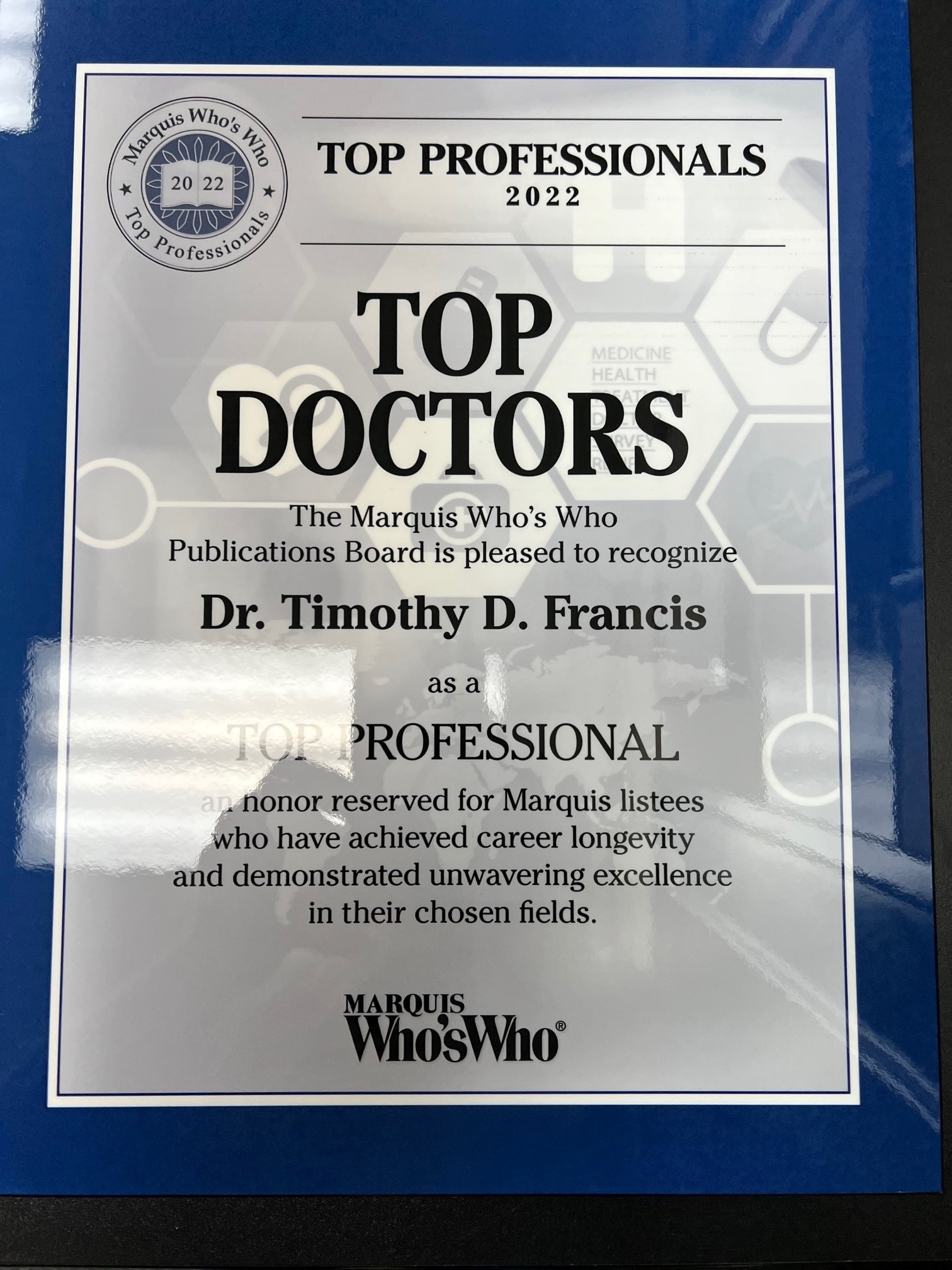 LAS VEGAS, NEVADA, UNITED STATES, June 22, 2022 /EINPresswire.com/ -- Marquis Who's Who Publications started in 1899, and it publishes biographies of global leaders and achievers from across the world and the United States. The online biographies help people understand the stories, facts, and inspirations that led Nobel Prize and Pulitzer Prize winners, athletes, best-selling authors, scientists, and entrepreneurs to achieve their professional goals. Recently, the Marquis Who's Who Publications Board included Dr. Timothy D. Francis in its directory of Top Doctors for 2022 who have achieved career longevity and demonstrated excellence.The healthcare industry presents an interesting paradigm for medical care where alternative medicine exists with traditional medicine, herbal medicine, naturopathy, homeopathy, and different alternative care options. There can be many disruptions, too, as medical technology continues to evolve. Many people seek holistic treatment in the same way that prompt medical intervention is crucial for the patient.