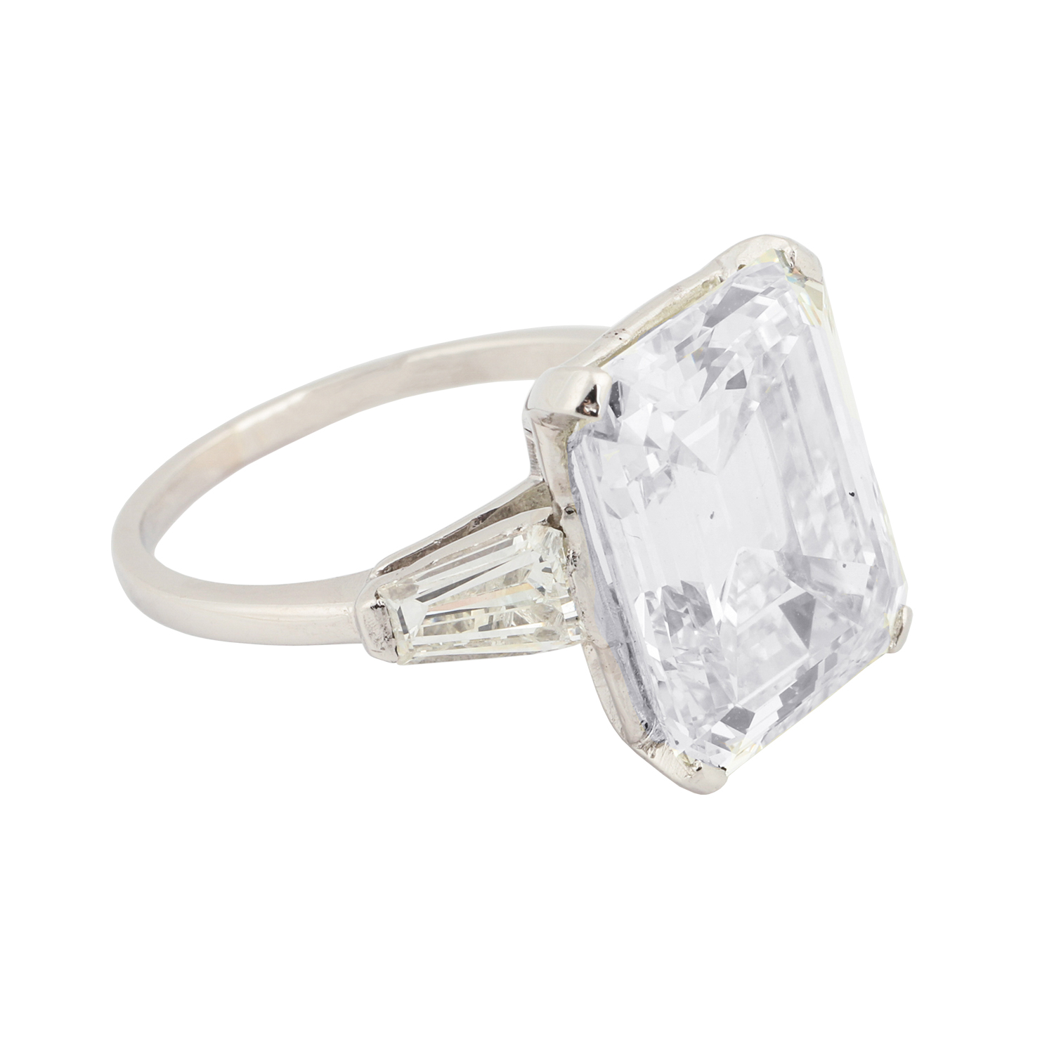 Dazzling 9.22-carat platinum emerald cut diamond ring with VS2 clarity and two baguette shoulder stones, graded M for color and Very Good for cut (CA$70,800).