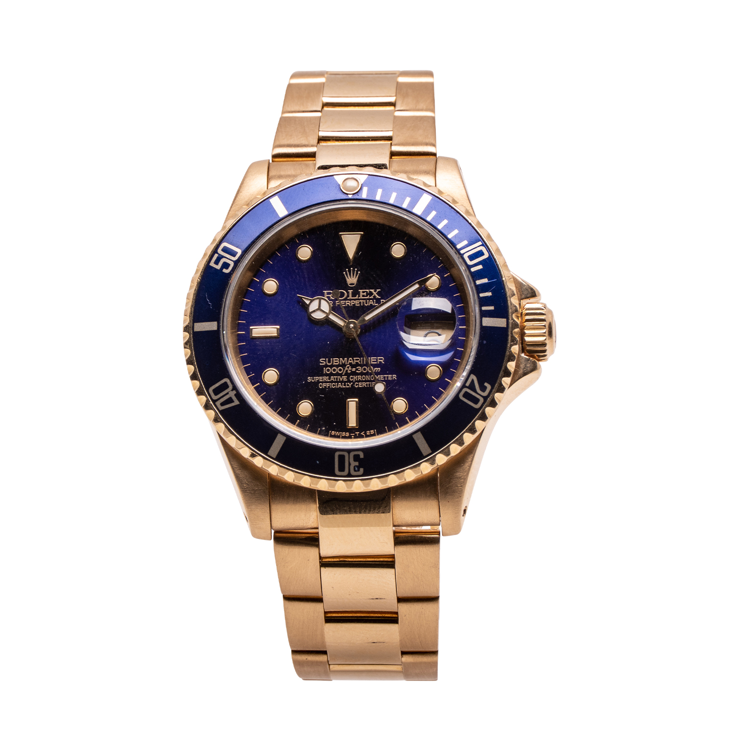 • A Rolex Submariner (Ref. 16613), with 18kt yellow gold and stainless steel band and 40mm case, two-tone oyster band, box, pamphlets and hang tag, 139 grams ($18,880).