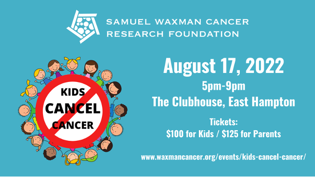 This inaugural event will take place on August 17th, 2022 at the Clubhouse in East Hampton from 5:00pm – 9:00pm. Tickets are $100 for kids, $125 for parents (adults). For more information, or to buy tickets, donate - visit www.waxmancancer.org/kids-cancel-cancer