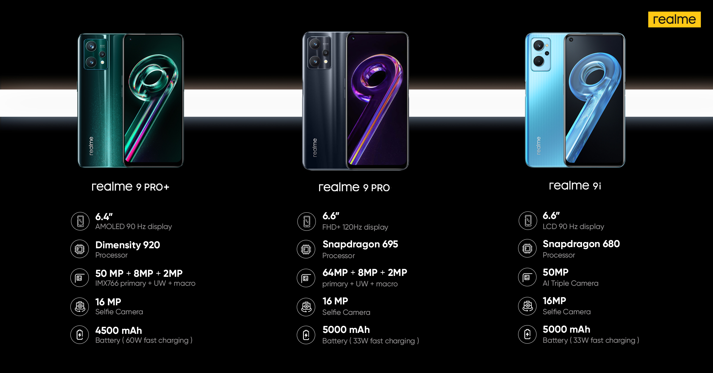 The realme 9 Pro+ and 9 Pro use a 6.4in and 6.6in, display respectively. realme 9 Pro+ features an outstanding 90Hz Super AMOLED display on a 6.4-inch screen that has a 90.8% screen-to-body ratio. The device also has an in-display fingerprint with a heart-rate sensor. While realme 9 Pro advantages include – Full HD+ supporting 120 Hz refresh rate. As for 9i – it is equipped with a good quality 6.6-inch 90 Hz LCD display making it a solid competitor in its price segment.
