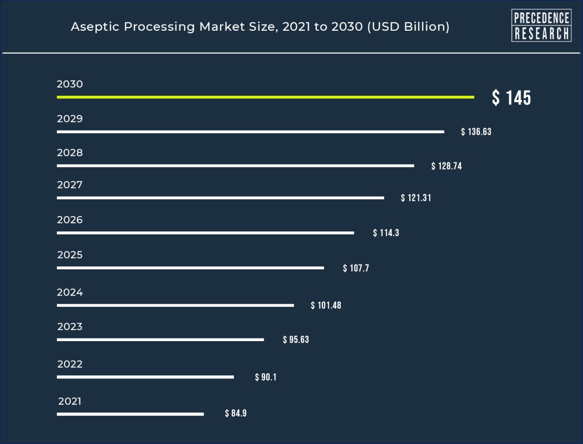 According to Precedence Research, the global aseptic processing market was valued at USD 84.9 billion in 2021 and is expected to hit around USD 145 billion by 2030 with a CAGR of 6.13% from 2022 to 2030.