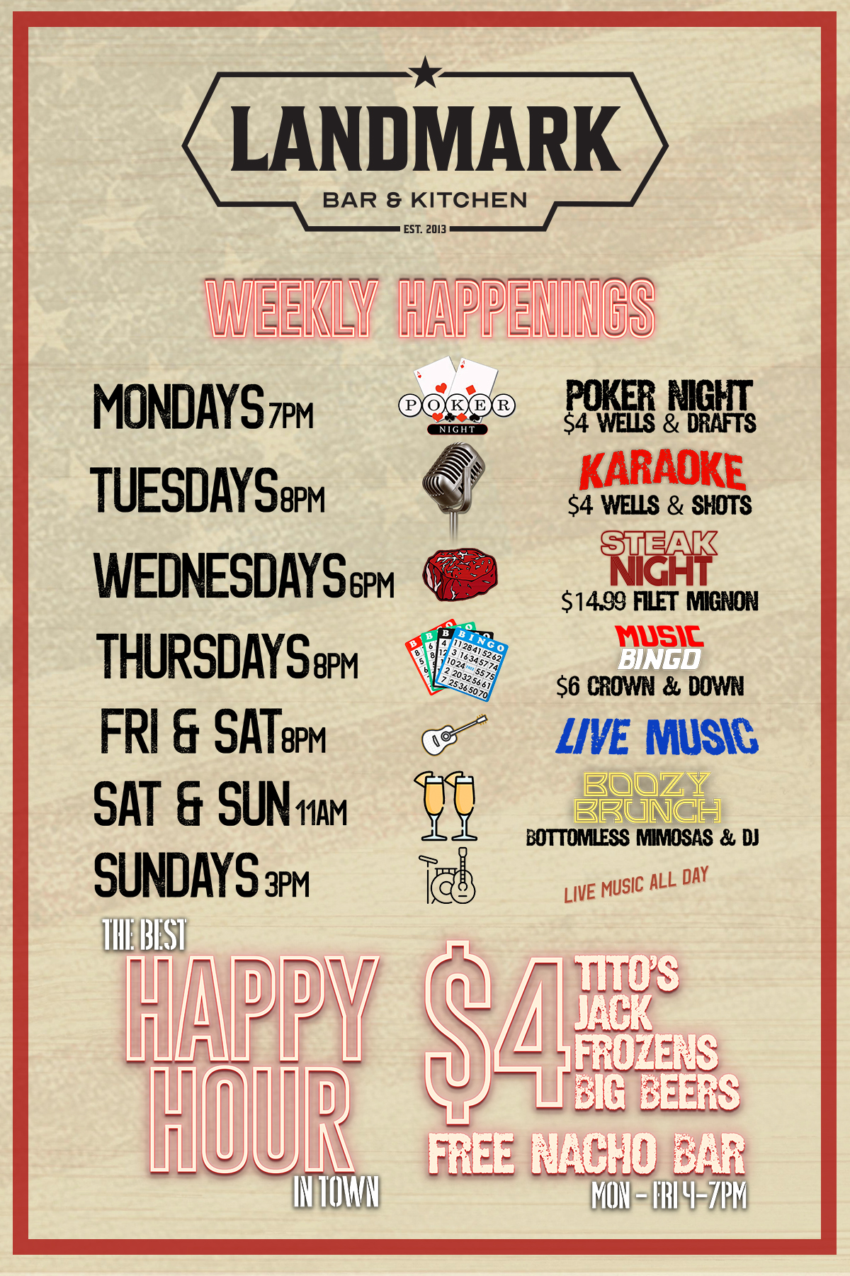 Landmark offers the best happy hour in the neighborhoods it serves, the Dallas location will feature a free Nacho bar and $4 Titos, Jack, Frozens and Big Beers to wash it all down Monday- Fridays 4-7PM! Landmark prides itself as having “Strokes For All Sort of Folks” and has nightly programming to appeal to everyone in the neighborhood. From Karaoke, Music Bingo, Steak Night ($14.99 Steak and Loaded Potato on Wednesdays), Boozy Brunch and Live music, there is always something going on.