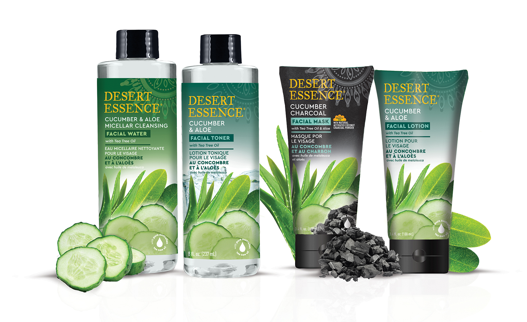 Desert Essence’s Cucumber and Aloe line is a stand-out favorite. Nothing says “clean” like cool cucumber and soothing aloe, which can be found in its popular Cucumber and Aloe Micellar Cleansing Facial Water, Cucumber and Aloe Facial Toner, and highly totable Cucumber and Aloe Facial Cleansing Pads. A Cucumber Charcoal Facial Mask, formulated with Activated Coconut Shell Charcoal, Bentonite Clay and pure Australian Tea Tree Oil is designed to draw out impurities, excess oil and everyday pollutants, leaving skin radiant and clear.