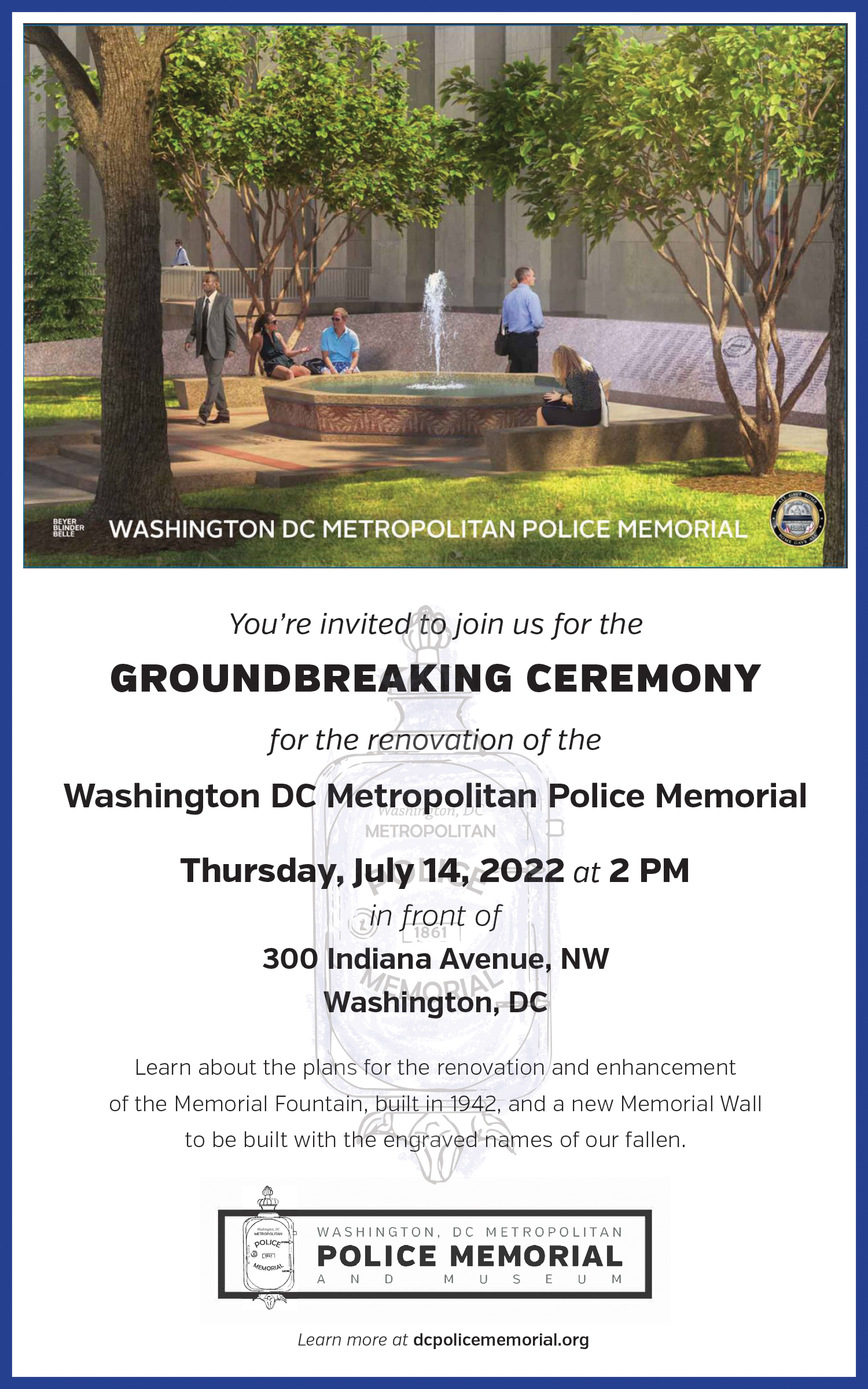The Washington, DC Police Metropolitan Police Memorial and Museum is announcing the Groundbreaking Ceremony for the Memorial. The ceremony will be held on Thursday, July 14, 2022 at 2pm in front of 300 Indiana Avenue, NW, Washington, DC.