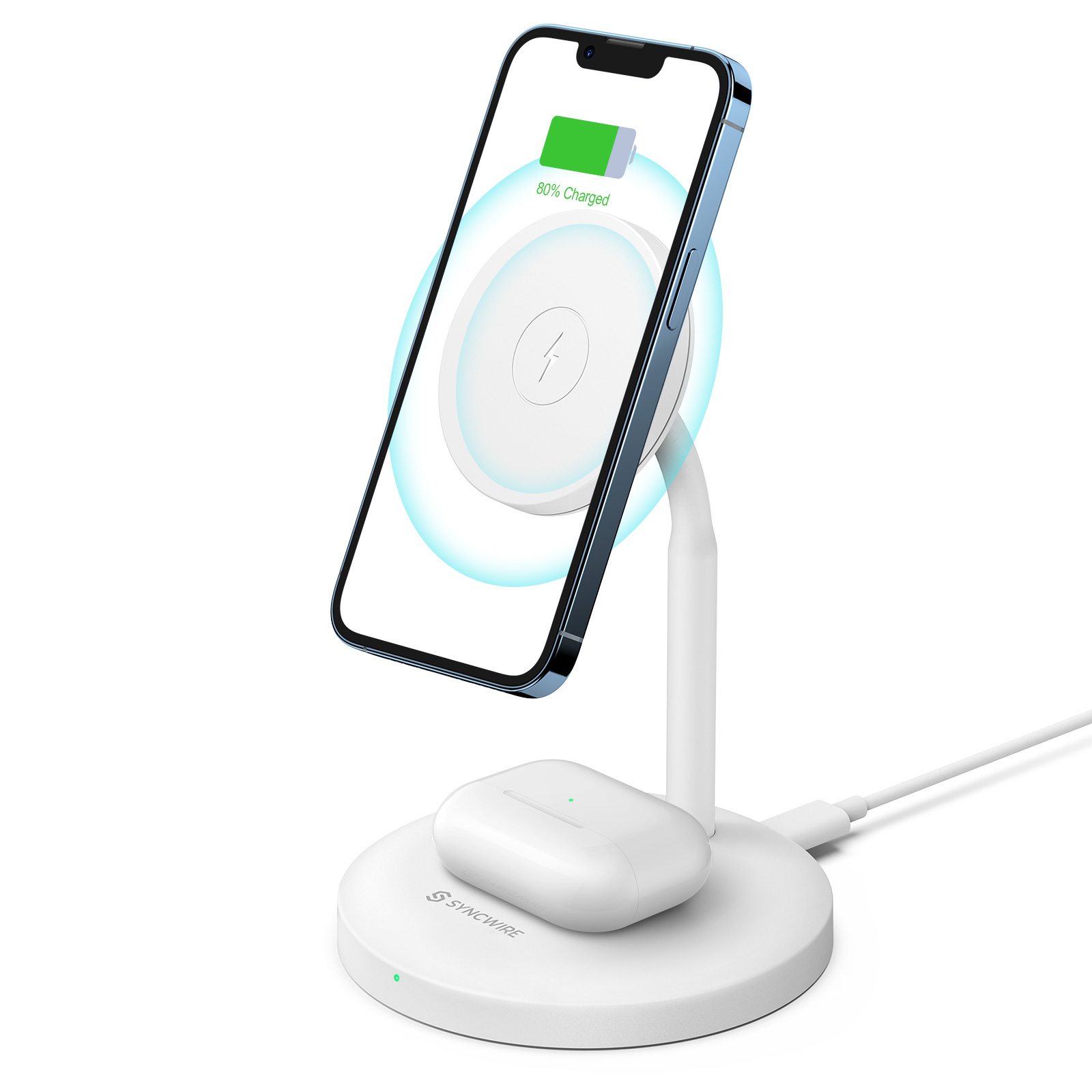 The Syncwire wireless charging stand is designed for iPhone 12 and 13 series (7.5W on top) and AirPods (5W on bottom). It charges at the same speed as the original MagSafe wireless charger and fully charges the iPhone 13 Pro in about 2.5 hours. For the best charging power to charge your iPhone and AirPods simultaneously, use a Type-C PD 20W or 20W+ charging adapter (not included).