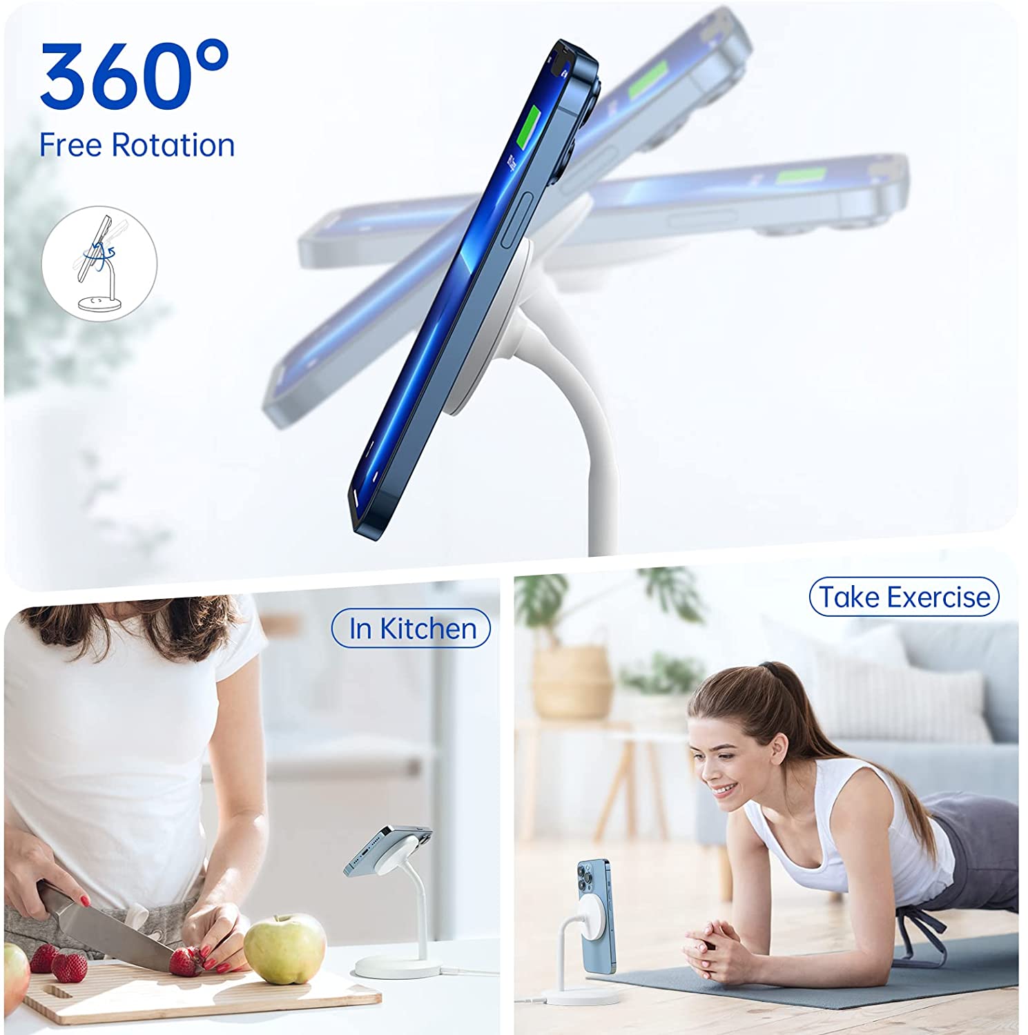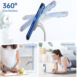 The joint is made of special military materials, which will not deform after fixing the angle, and the experiment has proved that it can withstand 10,000+ times of bending. The base is stable, the height is suitable, and the viewing angle can be flexibly adjusted according to the sitting posture. It is especially ideal for use on desks and nightstands, efficiently handling mobile phone information and FaceTime, and watching videos while charging.