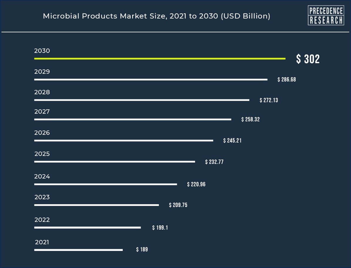 According to Precedence Research, the global microbial products market size is expected to be worth around USD 302 billion by 2030 from valued at USD 189 billion in 2021 and growing at a registered CAGR of 5.35% from 2022 to 2030.