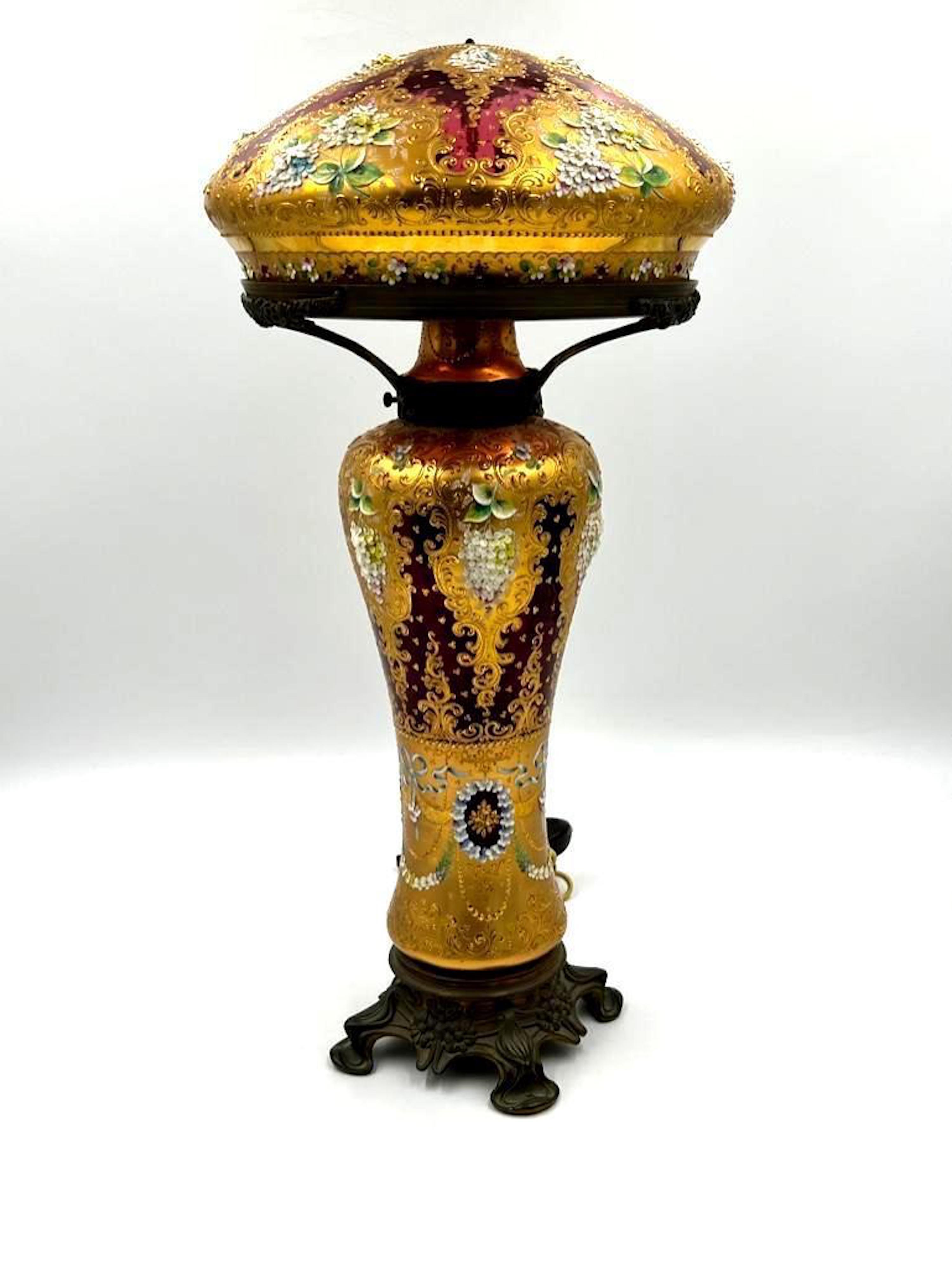 Lovely circa 1930 Moser cranberry glass enameled lamp with domed shade enameled in gilding and applied with sculpted enamel flowers, 25 inches tall (est. $4,000-$6,000).
