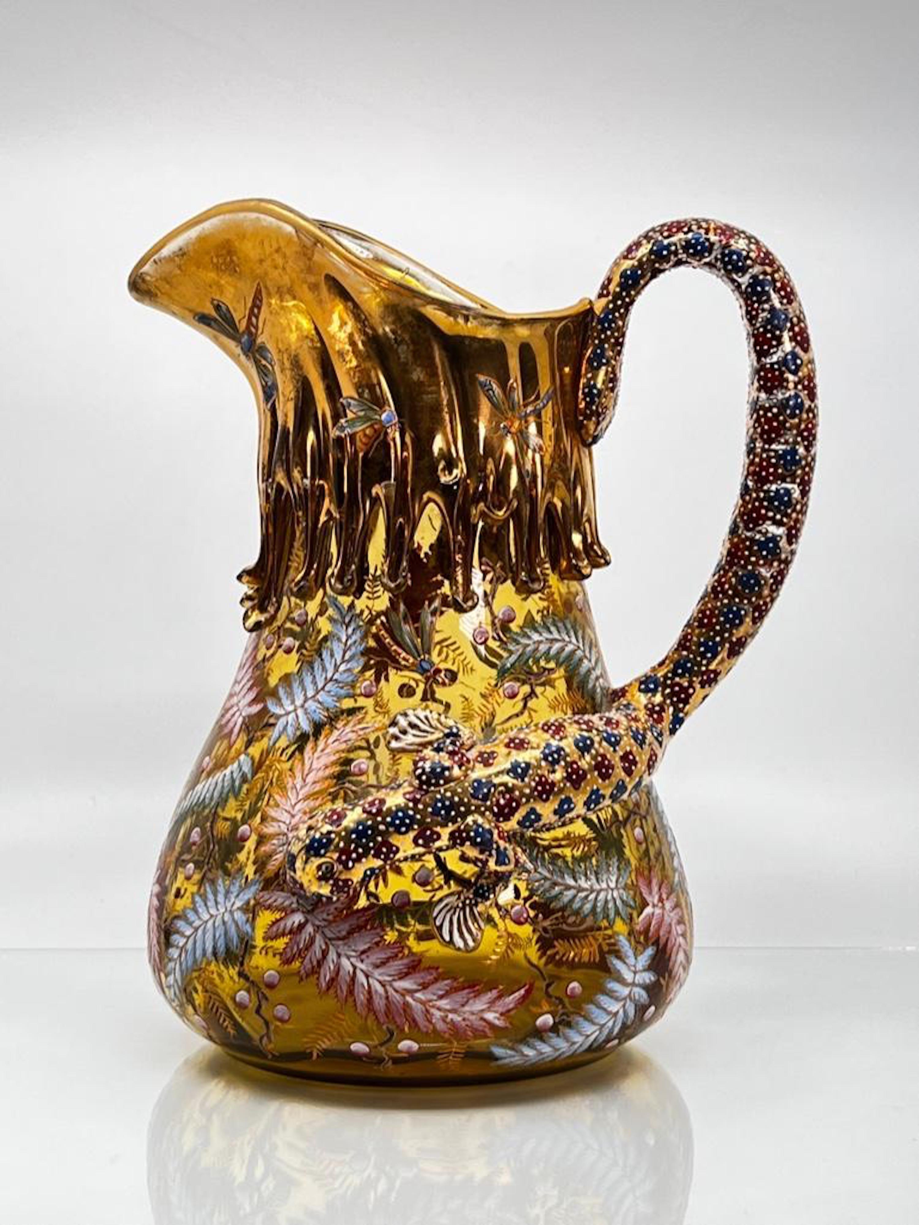 Circa 1890 Moser gilded and enameled pitcher in pale olive-green glass, 10 ¾ inches tall, with an applied scroll handle in the form of a salamander (or lizard) (est. 800-$1,200).