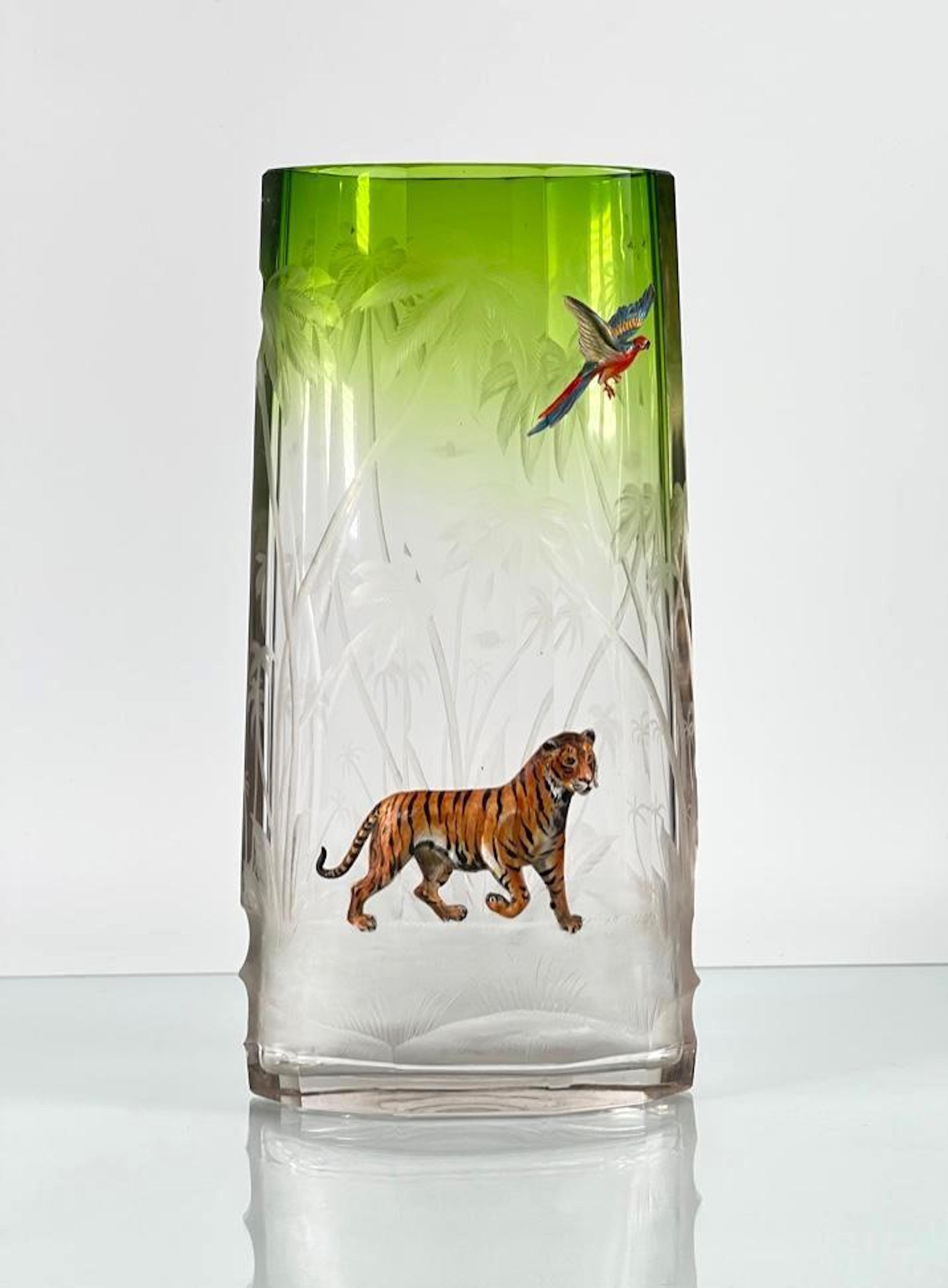 A circa 1890-1900 Moser vase engraved with a tropical landscape of palm trees centered by a high relief sculpted enamel figure of a striding tiger and a parrot in flight above, 13 inches tall, should reach $1,200-$1,800; while a gorgeous 16 ½ inch tall vase of bulbous cylindrical form in clear glass, engraved with a floral design and marquetry inset with a marquetry carved flower on a slender stem, carries a pre-sale estimate of $1,000-$2,000.