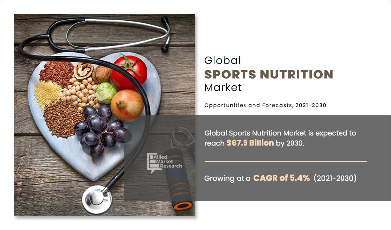 PORTLAND , OREGON, UNITED STATES, July 20, 2022 /EINPresswire.com/ -- Allied Market Research published a report, titled, "Sports Nutrition Market by Type, (Protein Powder, ISO Drink Powder, Sports Supplements, RTD Protein Drinks, Sports Drinks, Energy Bars, and Others), End User (Athletes, Bodybuilders, and Lifestyle Users), and Sales Channel (Hypermarket/Supermarket, Drugs and Specialty Stores, Fitness Centers, and Online Channels): Global Opportunity Analysis and Industry Forecast, 2021–2030." According to the report, the global sports nutrition industry was estimated at $34.8 billion in 2020, and is anticipated to hit $67.9 billion by 2030, registering a CAGR of 5.4% from 2021 to 2030.