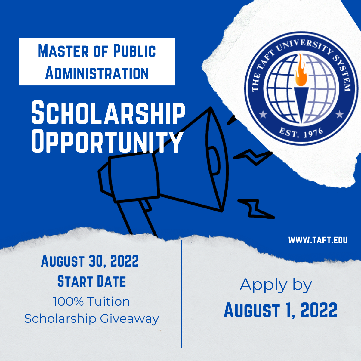 LAKEWOOD, CO, UNITED STATES, July 20, 2022 /EINPresswire.com/ -- William Howard Taft University is offering a 100% scholarship opportunity for their Master of Public Administration (MPA) program. Those who apply by August 1, 2022 for the August 30, 2022 start date will be entered to win a scholarship covering 100% of the cost of their tuition for the MPA program. Winner will be notified by August 15th. For applicants not selected for the scholarship, they will be eligible to receive 20% off their tuition rate during the program, lowering the cost to only $236.00 per credit, a total savings of $1,770.00. The $75.00 application fee is waived for anyone who applies by August 29, 2022.An MPA degree is a versatile degree that helps graduates become leaders and make a difference. This intensive, graduate degree program provides students with the skills and knowledge they will need to be successful professionals and engaged citizens serving the public good across local, national, and international government, nonprofit, and private sectors. The program meets the growing need to advance public policy, enhance public management, and bridge the private and public sectors. Its curricular focus is grounded in a comprehensive view of public service education that equips students with the skills needed to implement effective policy, manage organizations with diverse stakeholders, and apply rigorous, evidence-based analysis to inform decision-making.
