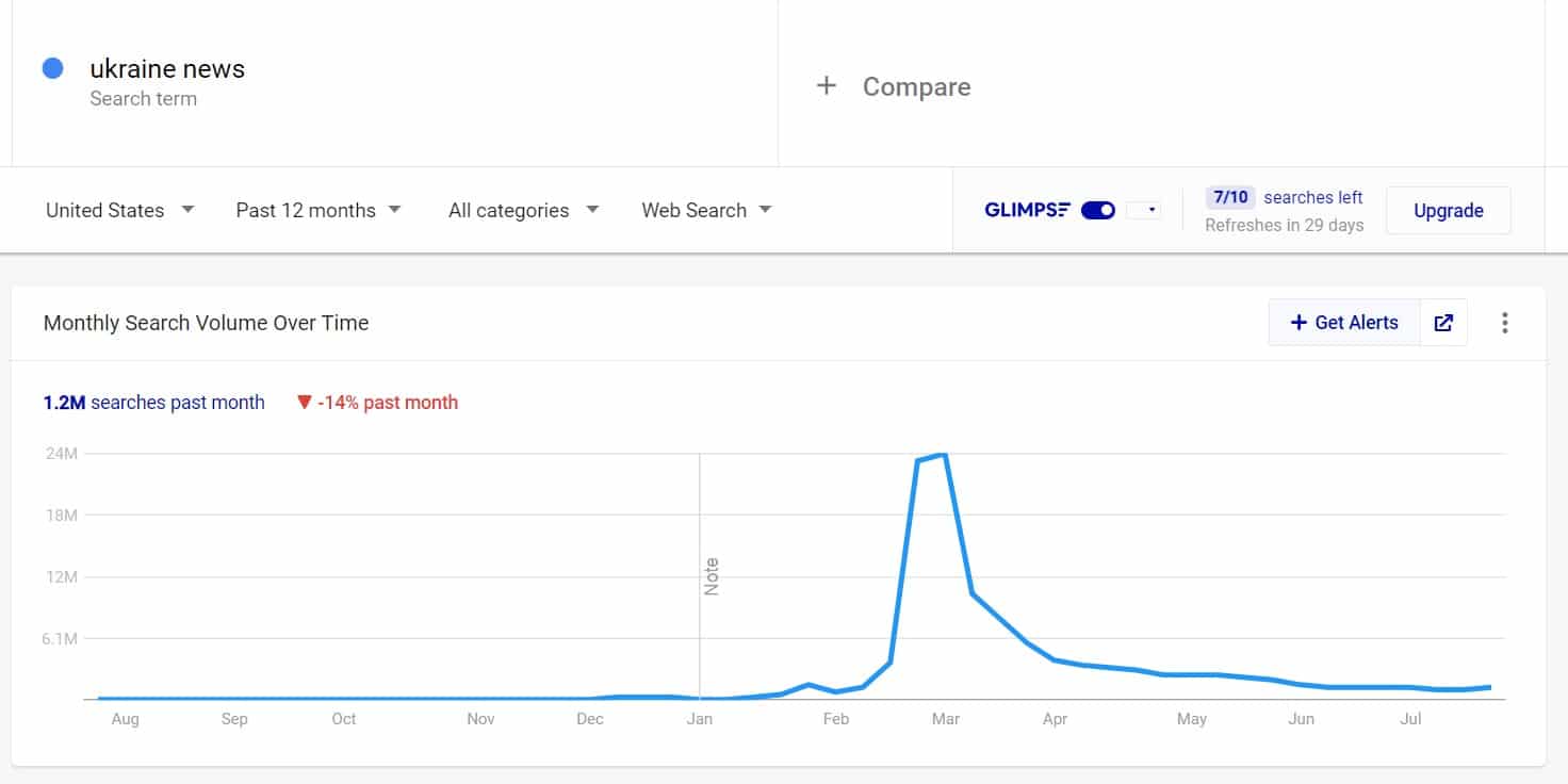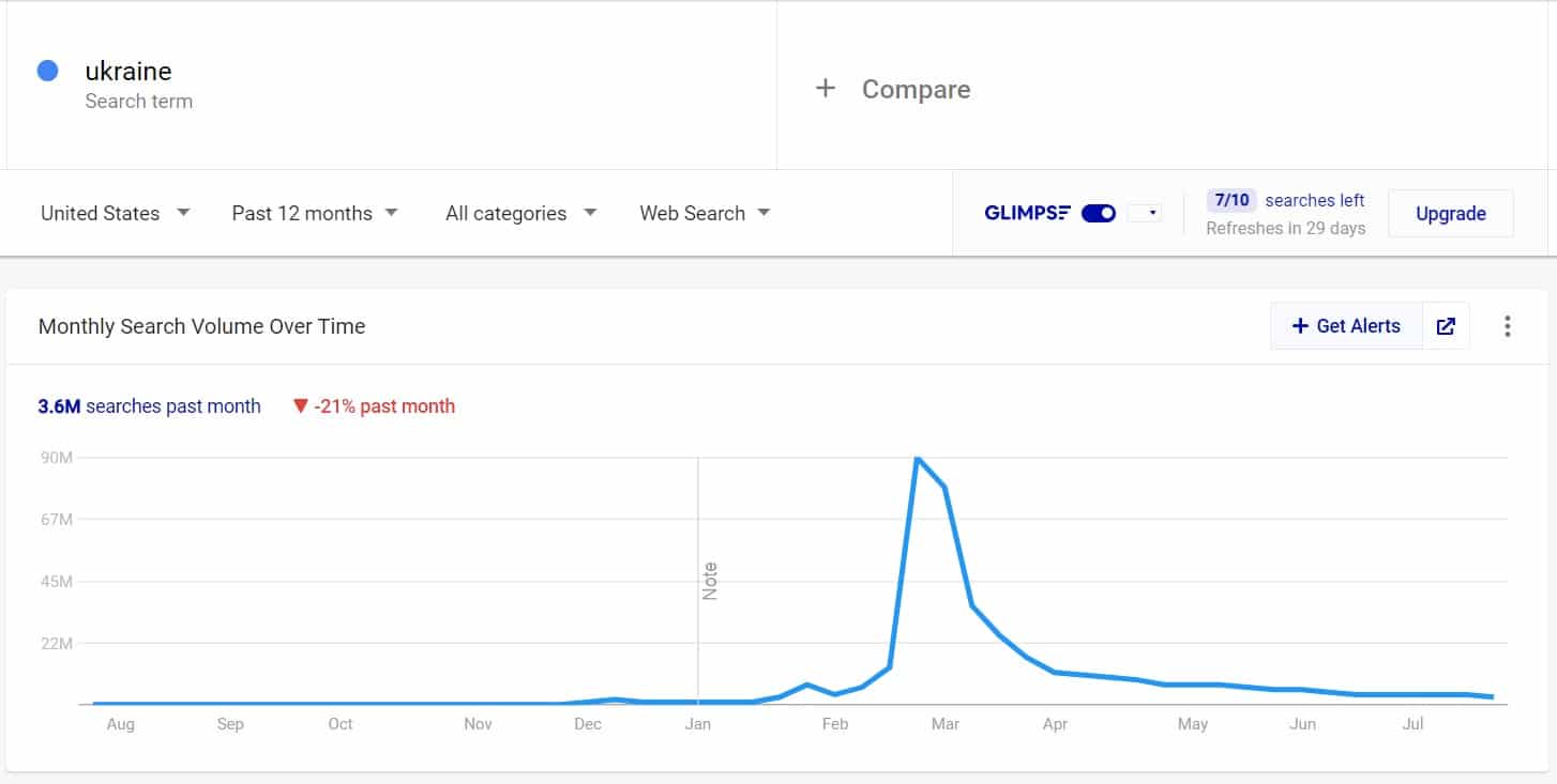 And while the support to Ukraine mainly comes from the USA Government in form of financial, humanitarian, and military aid this trend can negatively affect future aid from the USA to Ukraine as when the demand drops for Ukraine news then news outlets and journalists will cover this topic less often, which will result in a bigger decline of interest that could lead to Ukraine war disappearing from headlines.