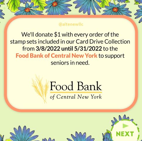 In addition to card donations, Altenew sets aside a certain amount from sales of handpicked parent-related stamp sets to provide monetary donations for senior-related causes. This year, Altenew donated $3,000 to their local food bank, the Food Bank of Central New York, which will in turn provide nutritious meals for locally based seniors.