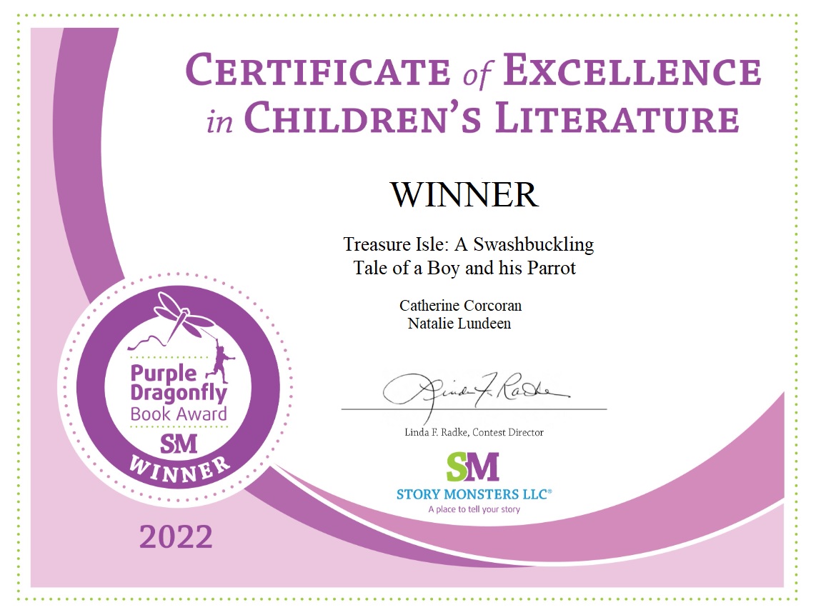 AUSTIN, TX, USA, August 1, 2022 /EINPresswire.com/ -- Treasure Isle: A Swashbuckling Tale of a Boy and his Parrot, an award-winning children’s picture book written by Catherine Corcoran and illustrated by Natalie Lundeen, has won the Purple Dragonfly children’s book award for 2022.