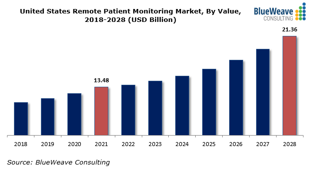 A recent study conducted by the strategic consulting and market research firm, BlueWeave Consulting, revealed that the United States patient monitoring market was worth USD 13.48 billion in the year 2021. The market is projected to grow at a CAGR of 6.9% during 2022-2028 (forecast period), earning revenues of around USD 21.36 billion by the end of 2028. The market is growing on account of increased demand for devices that monitor patients coming from hospitals and clinics. The characteristics of a patient are tracked or continuously measured using patient monitoring devices. It is important to constantly monitor a critically ill patient's oxygen saturation, blood pressure, temperature, pain, pulse, degree of consciousness, urine output, and breathing rate. All of these features are easily tracked with the use of various patient monitoring devices.
