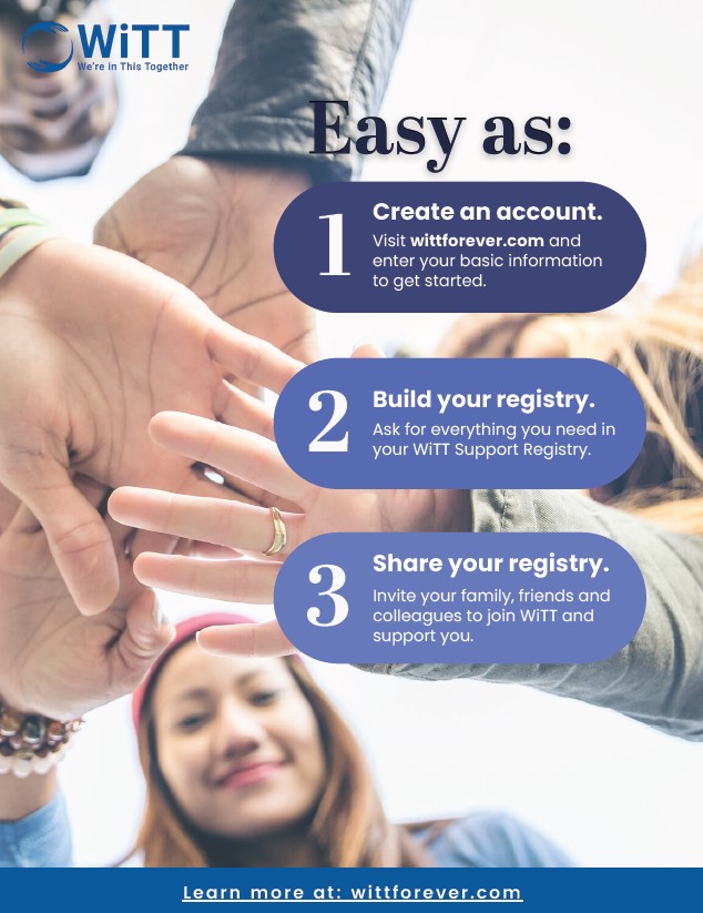 SANTA CLARA, CALIFORNIA, UNITED STATES, August 3, 2022 /EINPresswire.com/ -- The WiTT Group™, Inc., a company focused on solving the financial and non-financial challenges patients face as they go through treatment, is pleased to announce that it has launched the new WiTT Support Registry™ at www.wittforever.com, which empowers patients to get the support they need, as well as make it easy to ask for and receive help. WiTT, which stands for “We’re in This Together,” combines the simplicity of a wedding registry with the personalized needs of a patient and a financial tool, into an easy-to-use platform. WiTT’s initial focus is on cancer care.