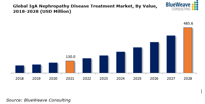 A recent study by the strategic consulting and market research firm; Blue Weave Consulting revealed that the Global IgA Nephropathy Disease Treatment Market was worth USD 130 million in 2021 and is projected to reach USD 485.6 million by the year 2028, growing at a CAGR of 20.8% during the period of 2022-2028. The growth of the IgA nephropathy disease treatment market can be primarily attributed to the escalation in demand for the treatment owing to the rising global renal disease burden. Moreover, the increasing investment in research, development, and healthcare infrastructure is further expected to drive the global IgA Nephropathy disease treatment market during the forecast period.