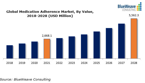 The global Medication Adherence market was worth USD 2,668.1 million in 2021, and it is further projected to reach USD 5,562.3 million by 2028, exhibiting a CAGR of 11.1% during 2022-2028 (forecast period). This can be attributed to the rising awareness about Medication Adherence due to growing programs and initiatives organized to educate people about the significance of medical adherence. Moreover, factors like the aging population, increment in healthcare expenditure and pharmaceutical usage, and the surge in the prevalence of cardiovascular diseases are likely to propel the market growth over the forecast period.