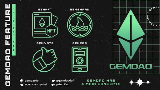 To connect potential projects closer to real investors, our Gemdao project development team will release the GEMDAO token along with an ecosystem including GemNFT, GemShark, GemVote, and GemPOS... Our ecosystem will bring a whole new experience to its users. Transparency in each transaction, passive income source, the decentralized system with decision-making power in GemDAO token holders' hands, supporting potential startups considered Mysterious Gems in the Crypto world.