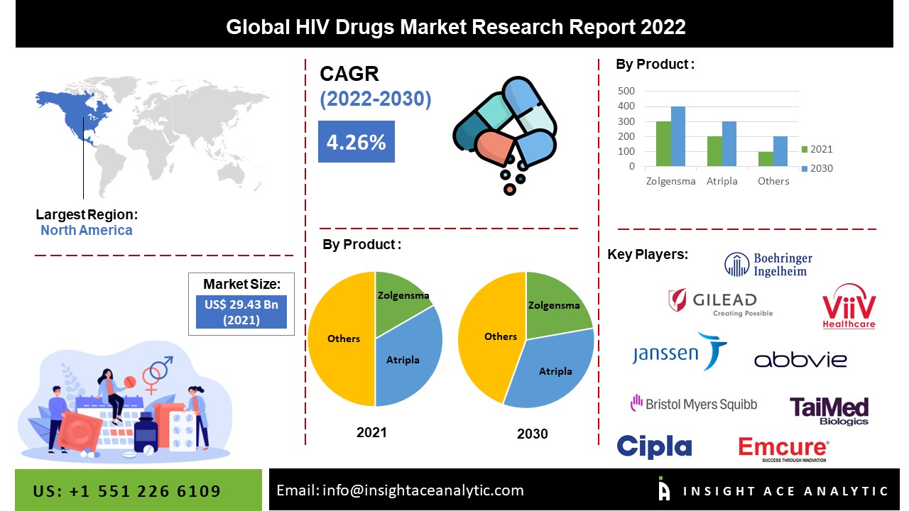 NEW JERSEY, NJ, USA, August 16, 2022 /EINPresswire.com/ -- InsightAce Analytic Pvt. Ltd. announces the release of a market assessment report on the "Global HIV Drugs Market- by Product (Zolgensma, Atripla, Biktarvy, Complera, Delstrigo, Descovy, Dovato, Genvoya, Isentress, Juluca, Odefsey, Stribild, Symtuza, Tivicay, Triumeq, Trogarzo, Truvada, Cabotegravir/Rilpivirine, Fostemsavir, Leronlimab and Others), Trends, Industry Competition Analysis, Revenue and Forecast To 2030."