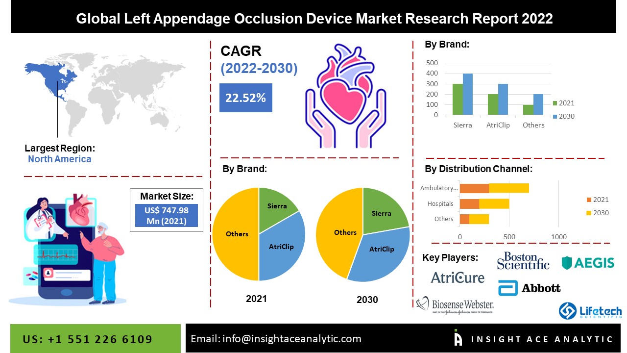 NEW JERSEY, SATTE NJ, COUNTRY USA, August 16, 2022 /EINPresswire.com/ -- InsightAce Analytic Pvt. Ltd. announces the release of a market assessment report on the "Global Left Appendage Occlusion Device Market- by Brand (Sierra, AtriClip, WaveCrest, Amplatzer Amulet, WATCHMAN, Ultrasept, LAmbre, and LARIAT), Distribution Channel (Hospitals, Ambulatory Surgical Centers, and Heart Clinics), Trends, Industry Competition Analysis, Revenue and Forecast To 2030."