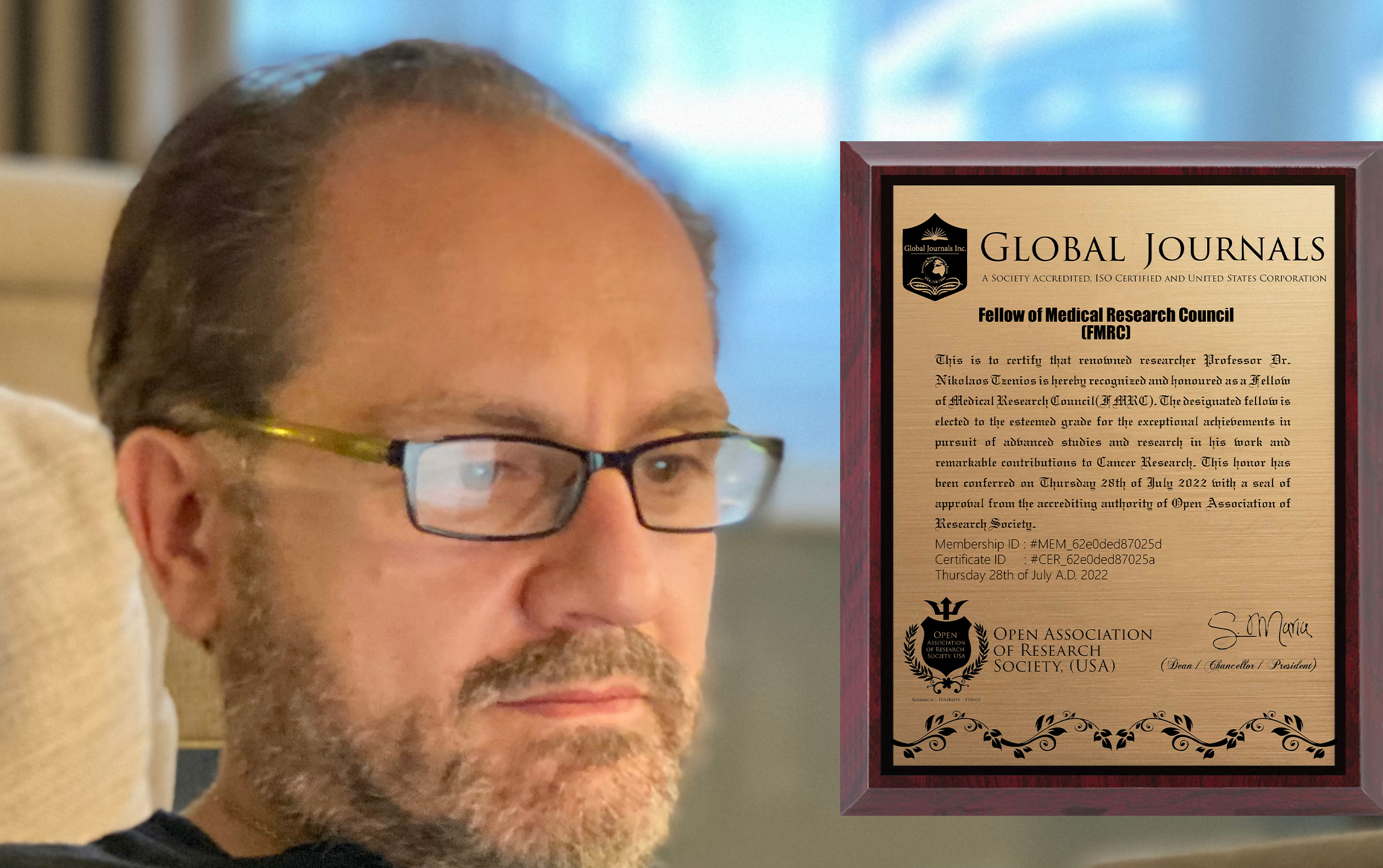 “This is to certify that renowned researcher Professor Dr. Nikolaos Tzenios is hereby recognized and honored as a Fellow of Medical Research Council (FMRC). The designated fellow is elected to the esteemed grade for the exceptional achievements in pursuit of advanced studies & research in his work and remarkable contributions to Cancer Research.” Dr. Vivek Dubey, (MS, Ph.D., University of Wisconsin) Secretary Open Association of Research Society, Delaware.