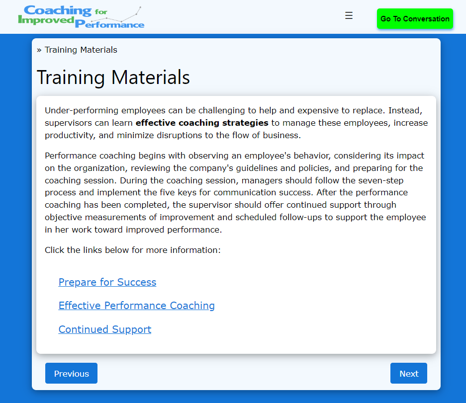 SIMmersion’s performance coaching training system includes all the necessary elements needed for supervisors to learn how to effectively support employees experiencing performance issues. These elements include: