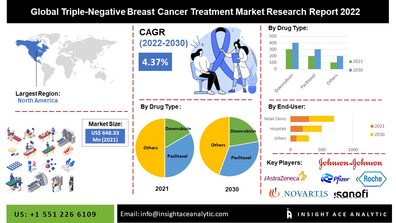 NEW JERSEY, NJ, USA, August 19, 2022 /EINPresswire.com/ -- InsightAce Analytic Pvt. Ltd. announces the release of a market assessment report on the "Global Triple-Negative Breast Cancer Treatment Market- by Drug Types (Doxorubicin, Cyclophosphamide, Paclitaxel, Docetaxel, Carboplatin/Cisplatin, and other Drug Type), End-Users (Hospitals, Cancer Research Institutes, and Retail Clinics), Trends, Industry Competition Analysis, Revenue and Forecast To 2030."
