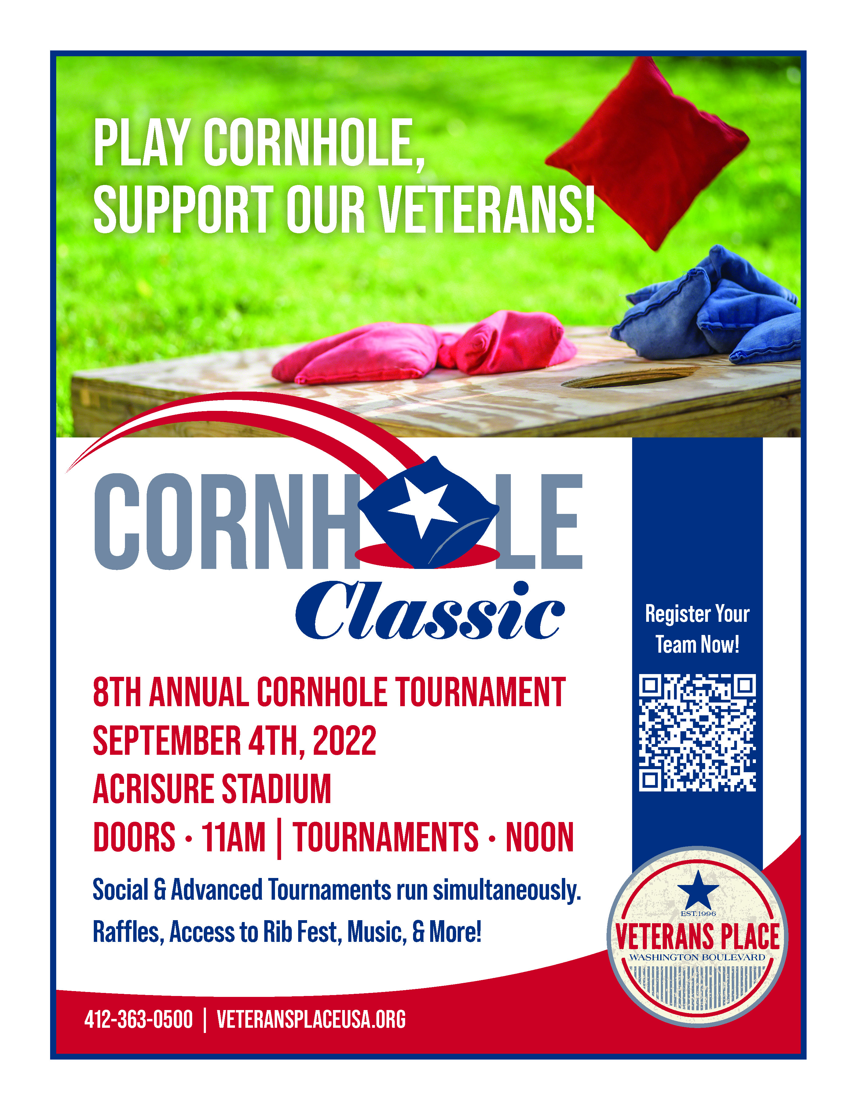 Early bird registration rates—Social $75, Advanced $100—through August 31, 2021. Tickets are also available for spectators ($10). To register a team or donate please visit: https://www.veteransplaceusa.org/cornhole for more information on sponsoring the event, please contact 412-363-0500.