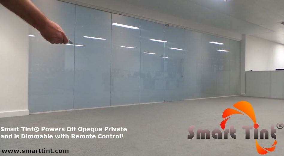 Simple privacy on command: Genuine Smart Tint® is transforming offices and conference rooms into personal spaces with the click of a button. Privacy is achieved when the glass changes from clear to opaque. It is also dimmable for those who wish to variably control the level of tint. Genuine Smart Tint® is ideal for corporate conference rooms, office spaces, boardrooms, reception vestibules, bathrooms and any glass that requires instant concealment without the use bulky curtains or blinds. It is hypoallergenic, easy to clean, and blocks 99% of UV rays. Genuine Smart Tint® is manufactured in the USA and available factory direct at www.SmartTint.com. Offering high clarity and performance, every project is customized and installed strategically to custom fit each application.