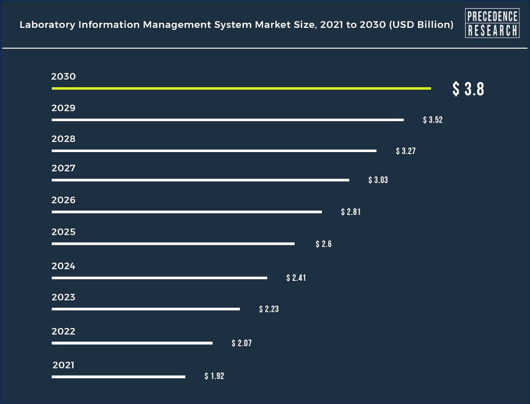 According to Precedence Research, the global laboratory information management system market size is projected to reach around USD 3.8 billion by 2030 and growing at a CAGR of 7.88% over the forecast period 2022 to 2030.
