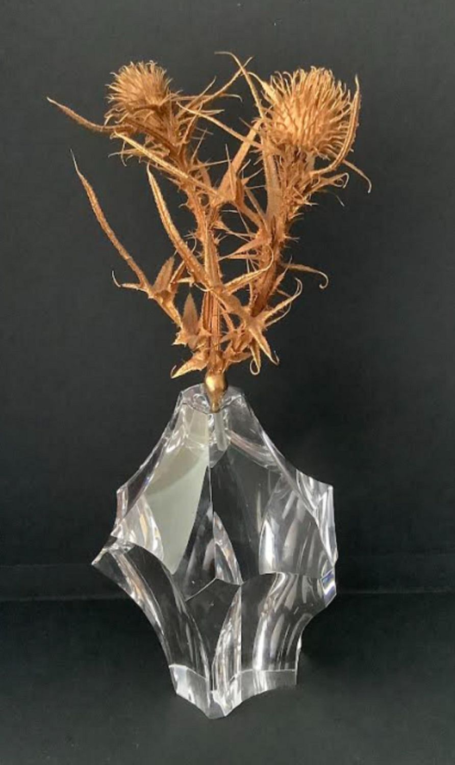 Steuben crystal vase with a 24kt gold vermeil (gold-plated silver) thistle weed finial, 4 inches tall minus the finial (est. $2,000-$5,000).